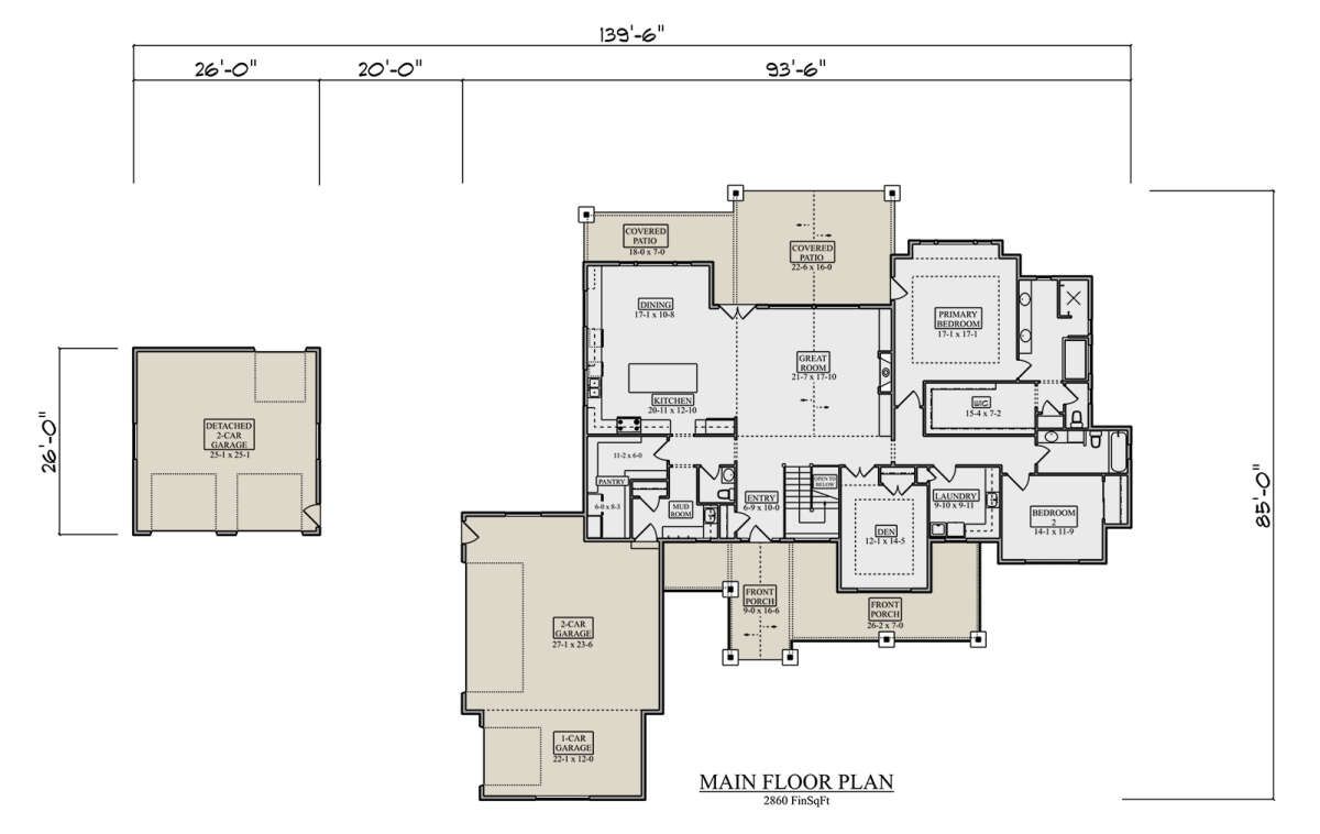 All 2,860 square feet of living space is arranged on one level, offering convenience and easy accessibility. The layout is carefully designed to separate shared living spaces from private bedroom areas, creating a comfortable and functional flow throughout the home. 2