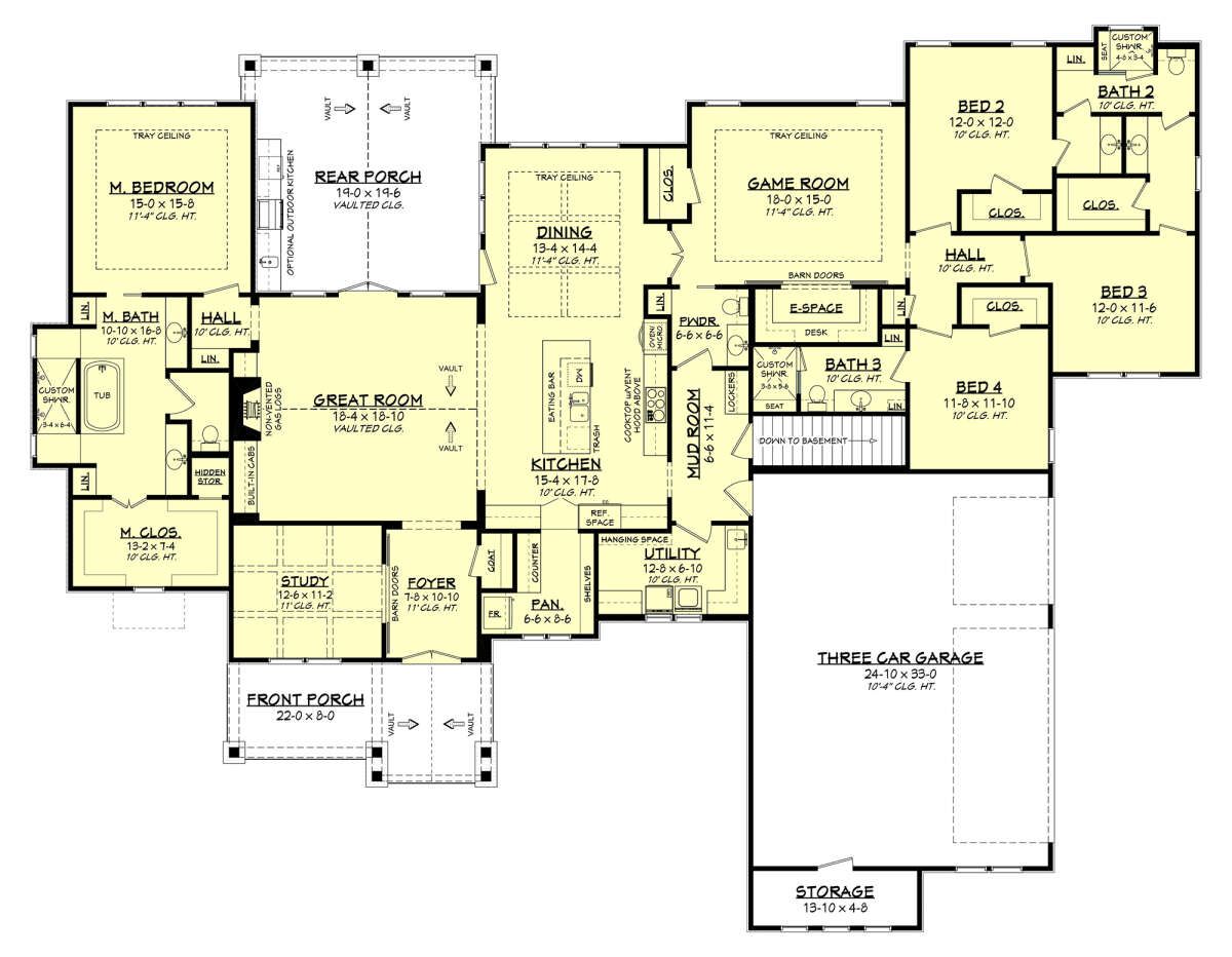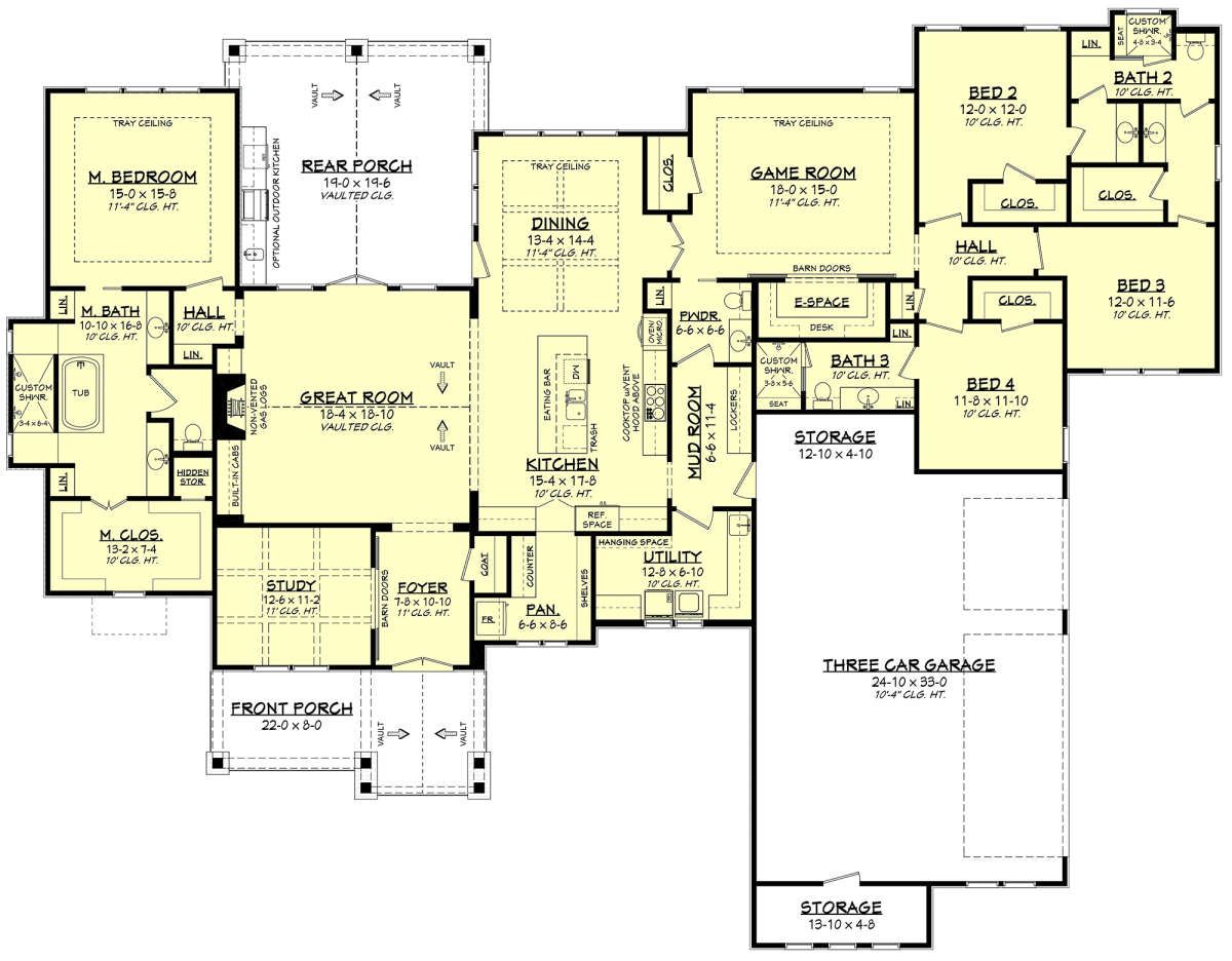 The design includes three full bathrooms and one half bathroom, ensuring convenience throughout the home. 4