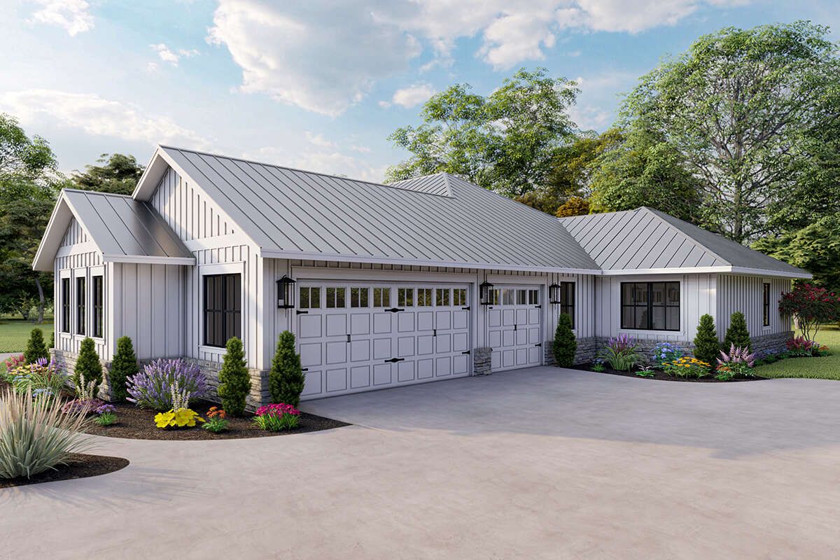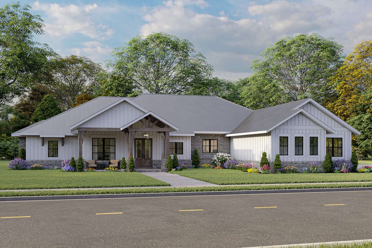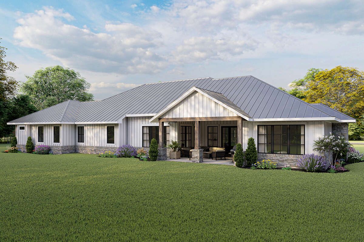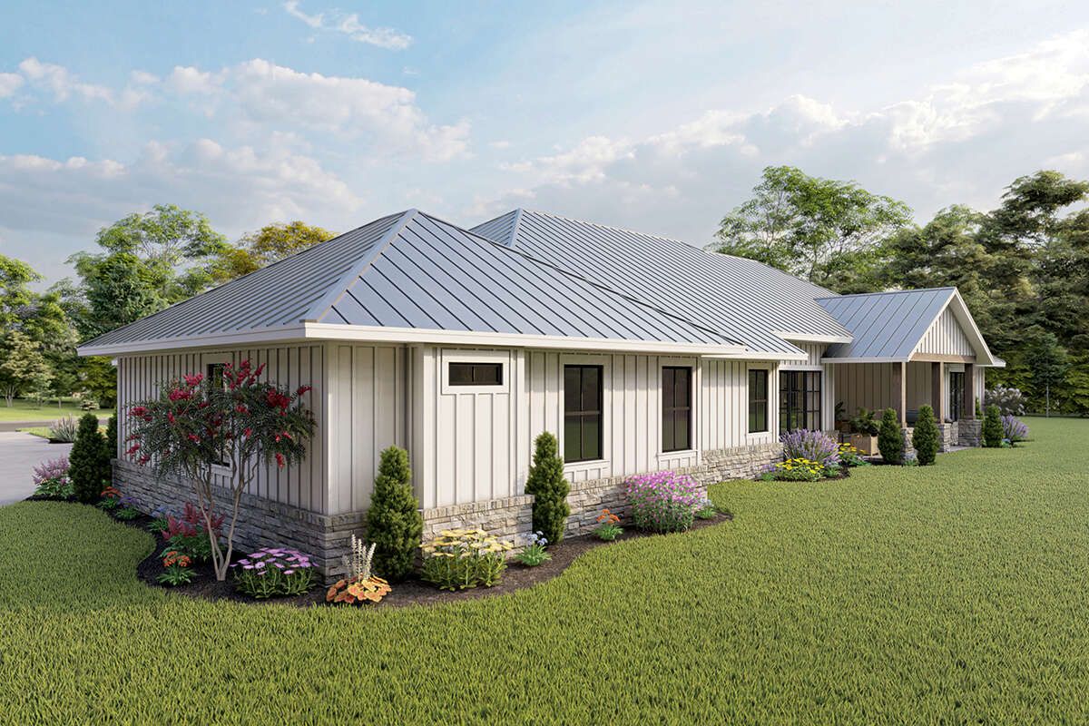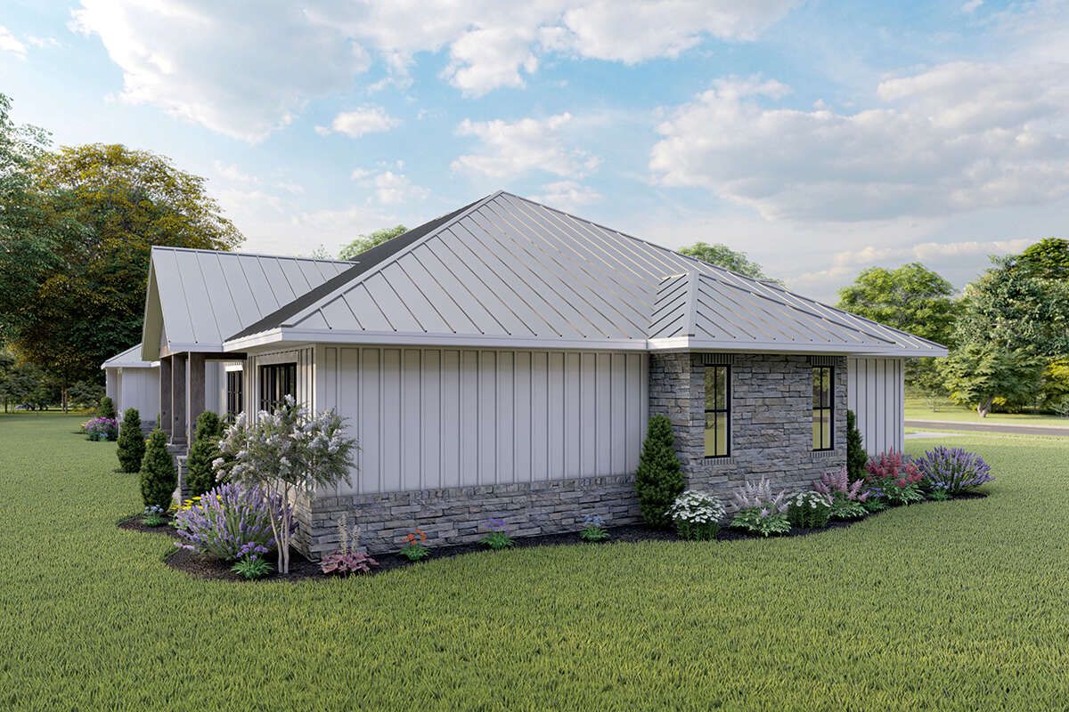 The design allows for covered porches or patios, extending the living space outdoors.