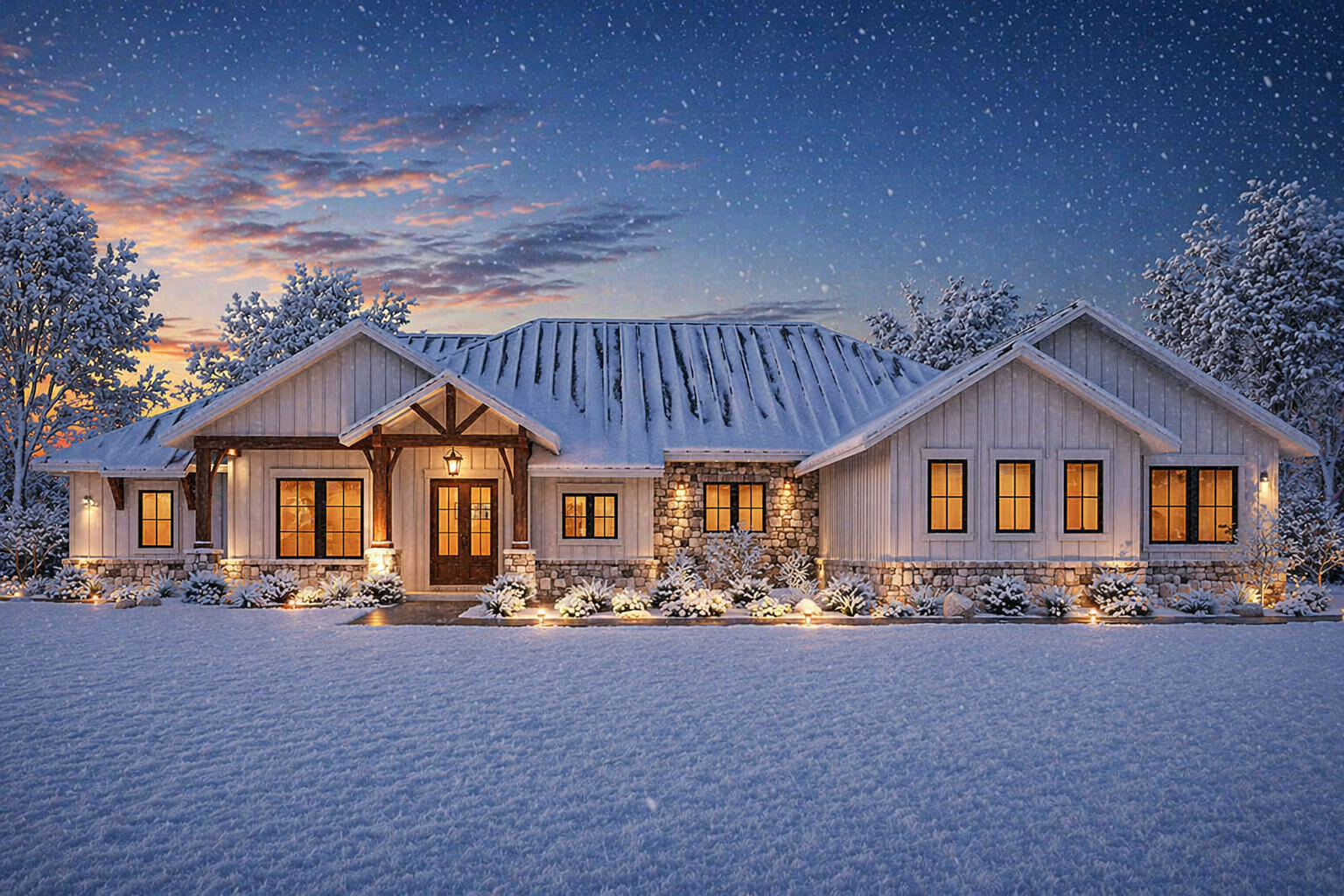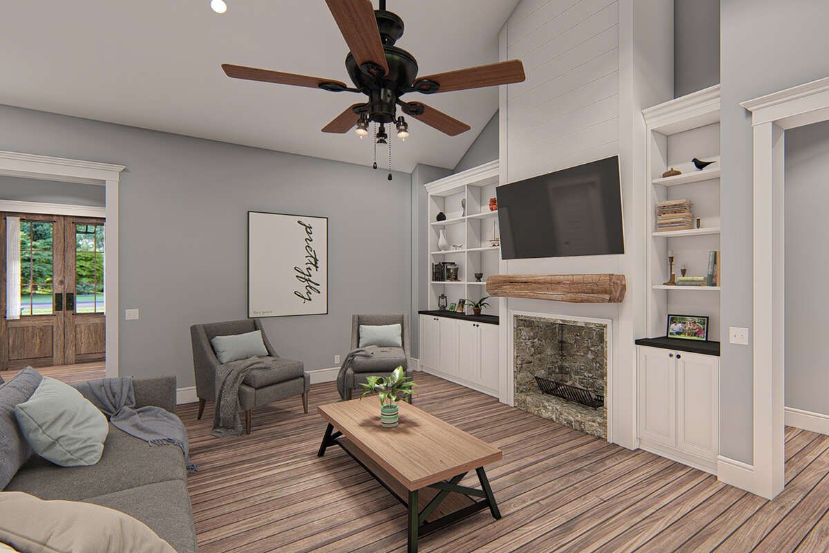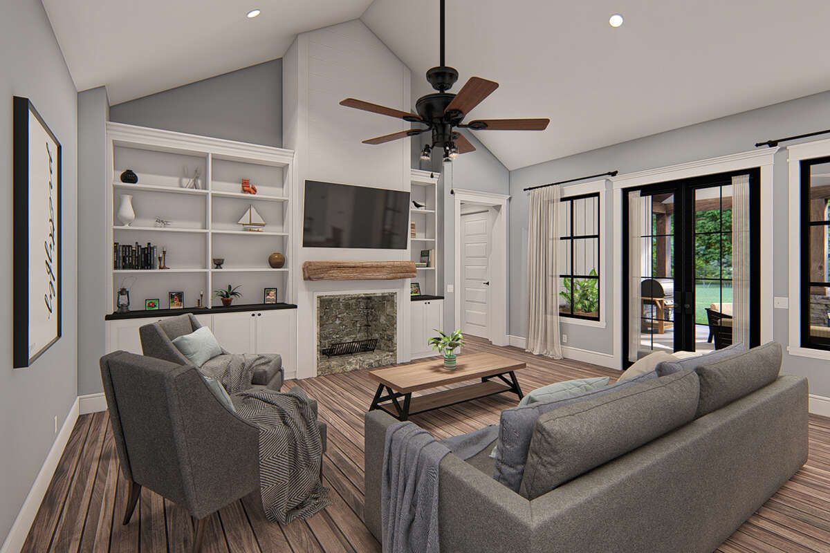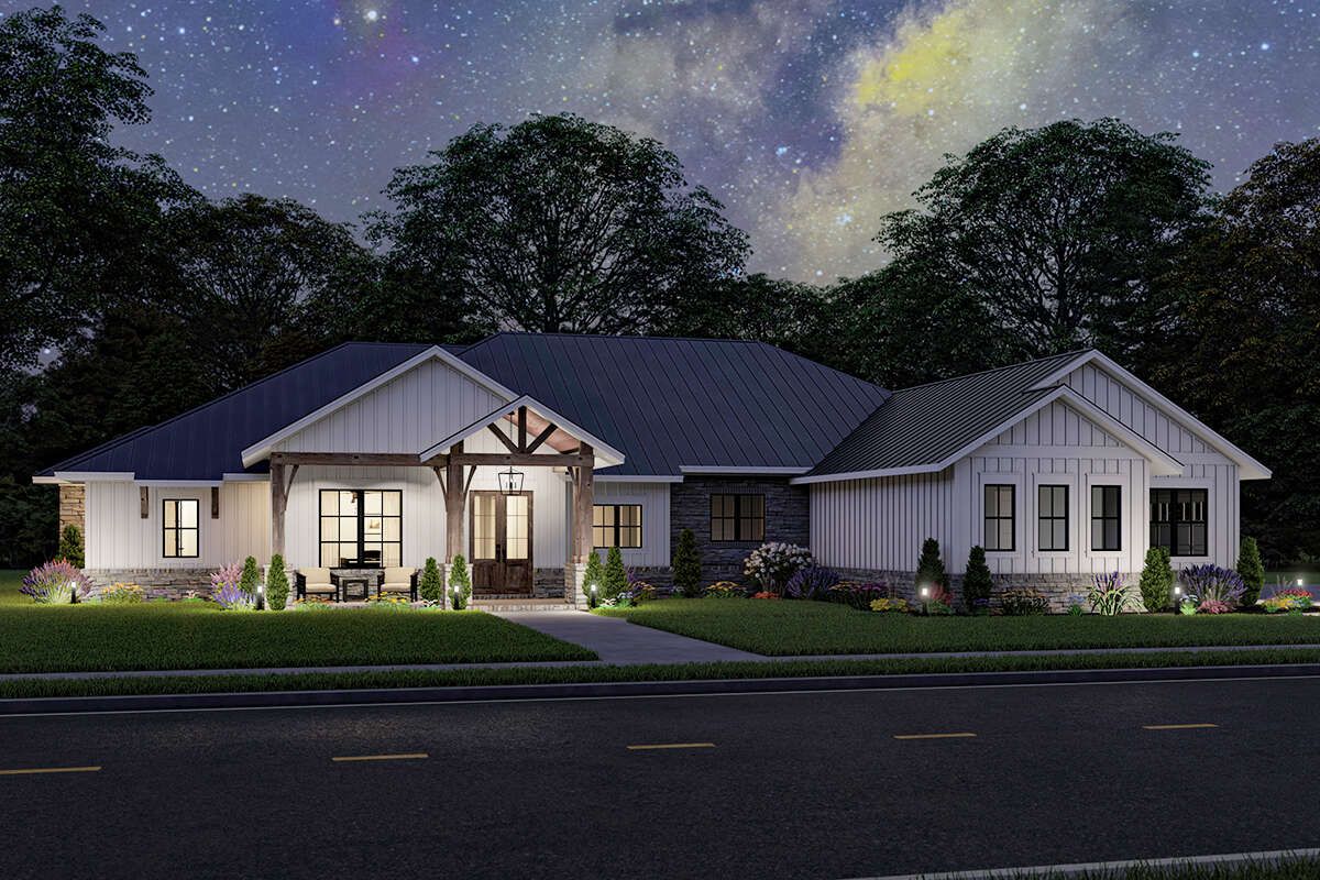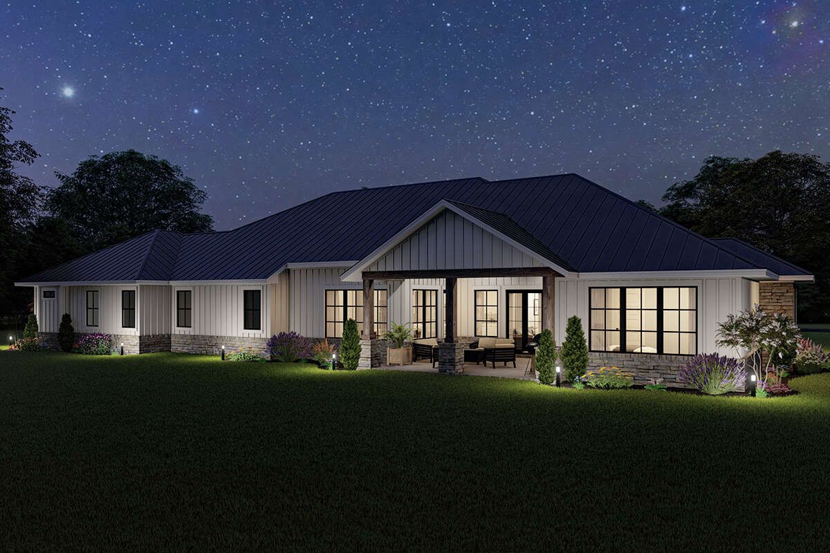 The design allows for covered porches or patios, extending the living space outdoors.