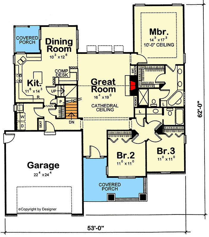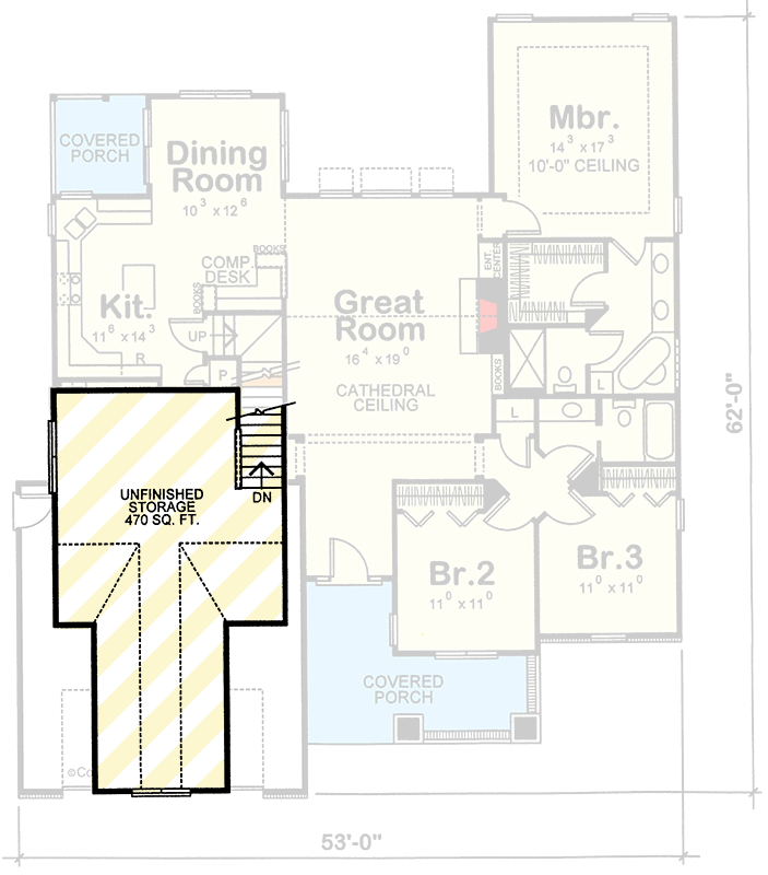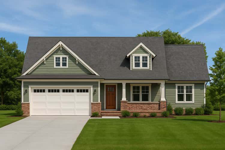 The home’s exterior embodies classic Craftsman aesthetic — a combination of traditional siding and brick accents paired with decorative columns and gentle roof pitches. 1 A broad covered front porch welcomes you and sets a relaxed tone, perfect for morning coffee or watching the neighborhood activity. 2 At about 53′ wide × 62′ deep, the footprint is comfortable for suburban or countryside lots without feeling oversized. 3