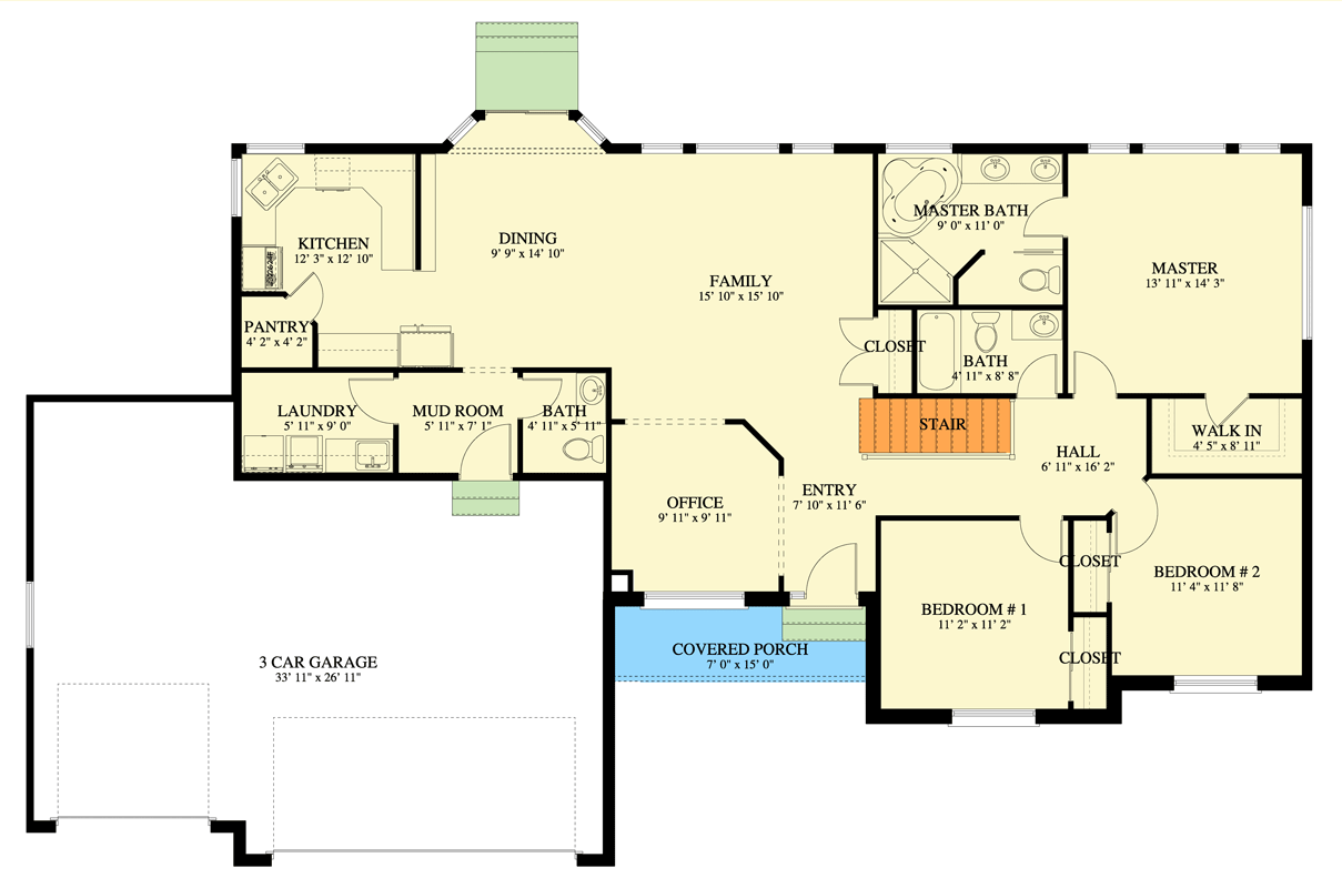 This ranch plan is organized for comfortable one-level living, with open, flowing shared areas and well-defined private zones. A central foyer opens directly into the heart of the home, where living spaces, dining, and kitchen areas connect for ease of movement and interaction. Natural light from well-placed windows helps create bright, inviting interiors. 2