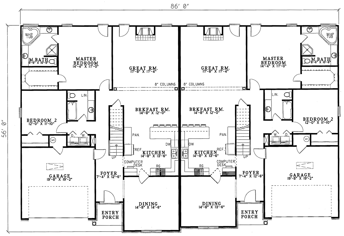 The building presents a two-unit layout with a shared structure but clearly separated living quarters: the overall width and depth (shared across both units) remain modest enough for many lots. 0