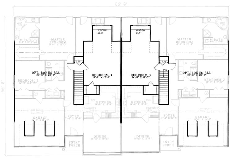 This duplex design offers two nearly identical units, each with about 2,259 sq ft of living space (about 1,868 sq ft on the main floor and roughly 384 sq ft upstairs). Each unit features 3 bedrooms, 2 full bathrooms, and an attached garage — combining generous living space with the efficiency of duplex living. 0