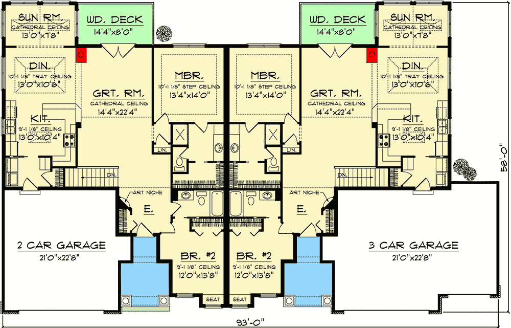 - Dimensions (overall building): ~93′ wide × ~58′ deep; ridge height ~21′ 6″ 19