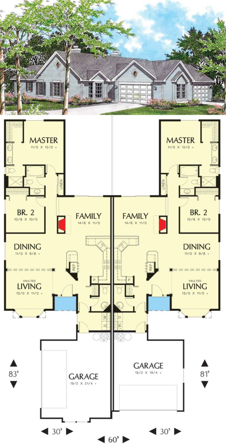 - Shared structural elements: Because the two units share walls and roof, material and labor costs are reduced compared with two separate homes — making this plan efficient to build