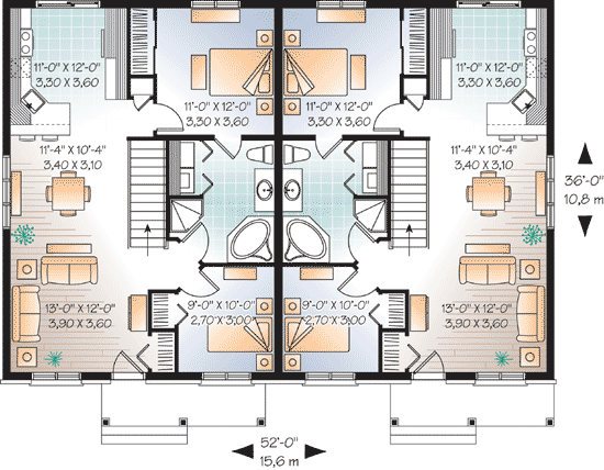 • Mirrored layouts simplify construction and give both households equal comfort and convenience.
