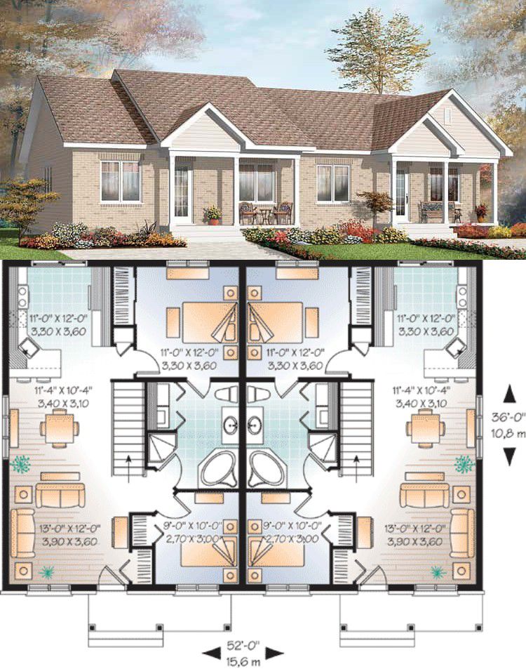 • Mirrored layouts simplify construction and give both households equal comfort and convenience.