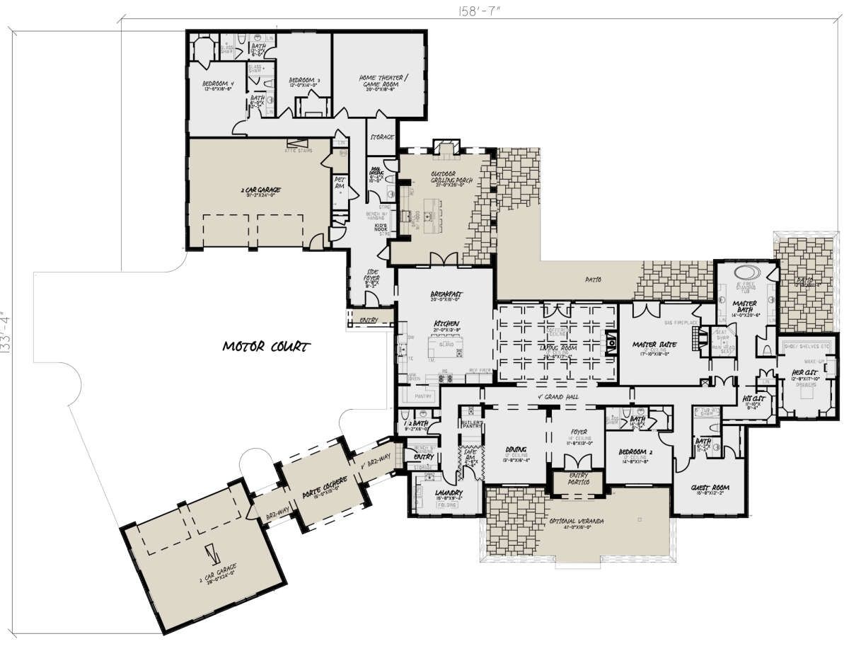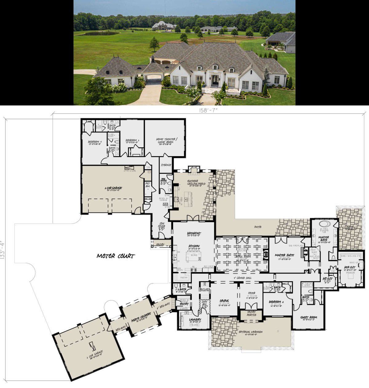 With overall dimensions of approximately 158 feet 7 inches wide and 133 feet 4 inches deep, the home has a commanding presence and is best suited for large plots. 1