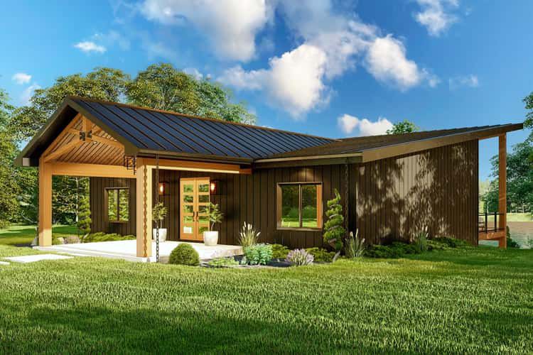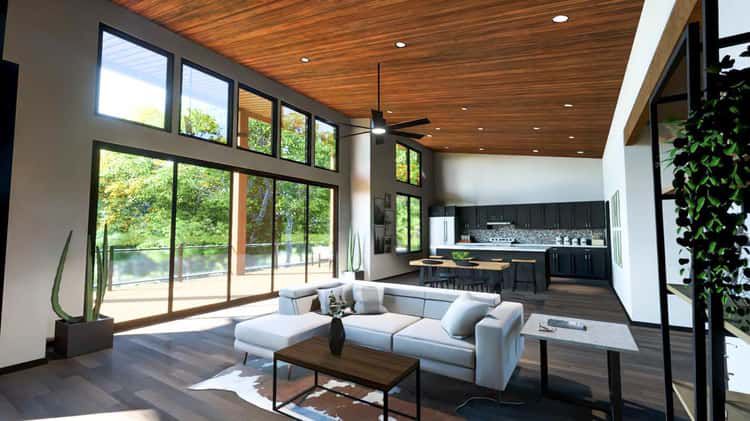 The exterior embodies a modern cabin aesthetic that feels right at home on a lakeside, hilltop, or wooded lot. Clean lines, generous glazing, and simple yet purposeful detailing create an eye-catching facade that feels contemporary without being cold. 1 The home’s form is uncomplicated and grounded—which makes it ideal for narrow lots, rear-sloping terrain, or sites where the back elevation steals the show. 2