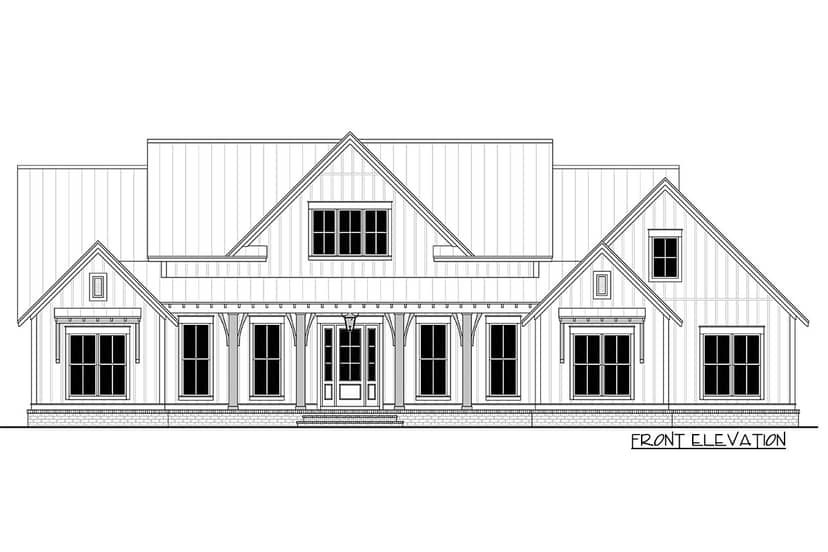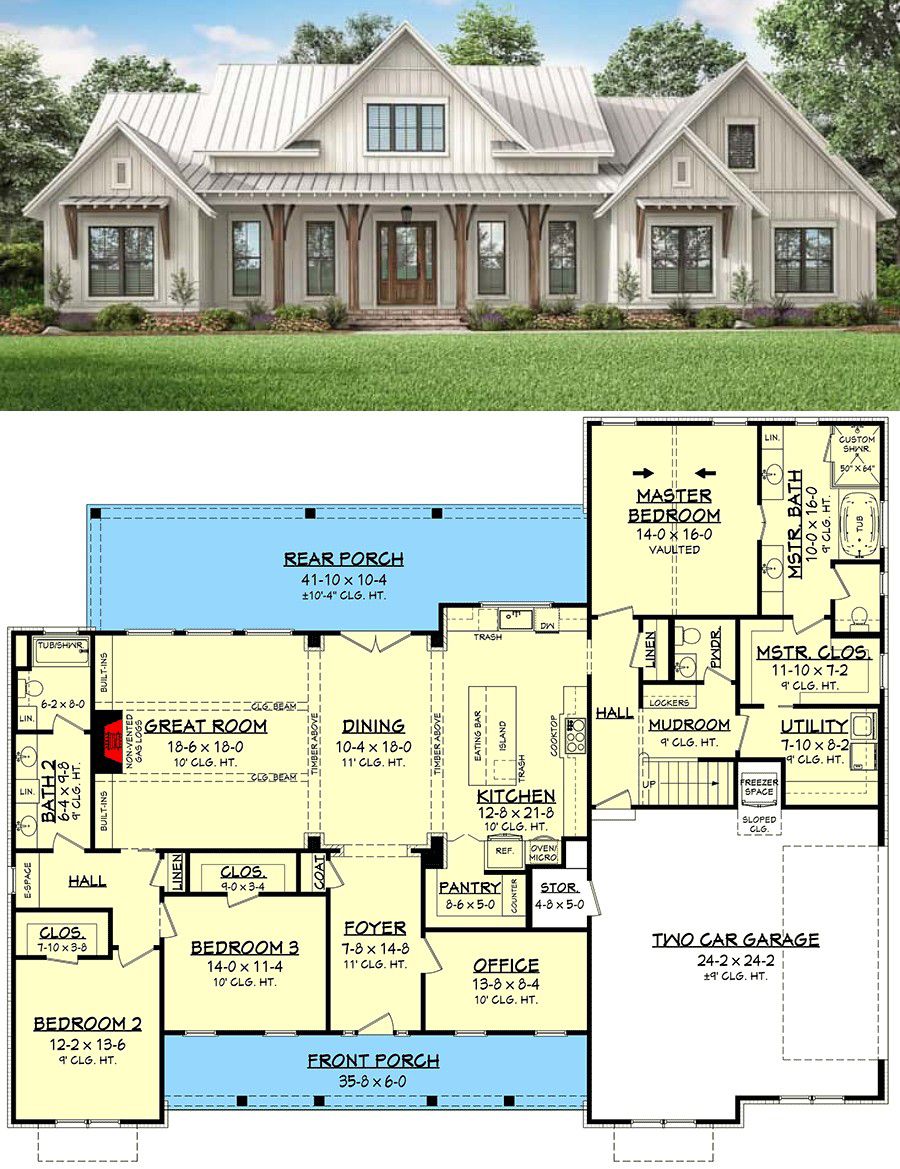 The façade captures the modern-farmhouse aesthetic: a welcoming c> “This modern farmhouse plan expands on a popular earlier version and trades the formal dining room for a dedicated home office — a smart move for modern living.” — Plan description for 51814HZ. 14