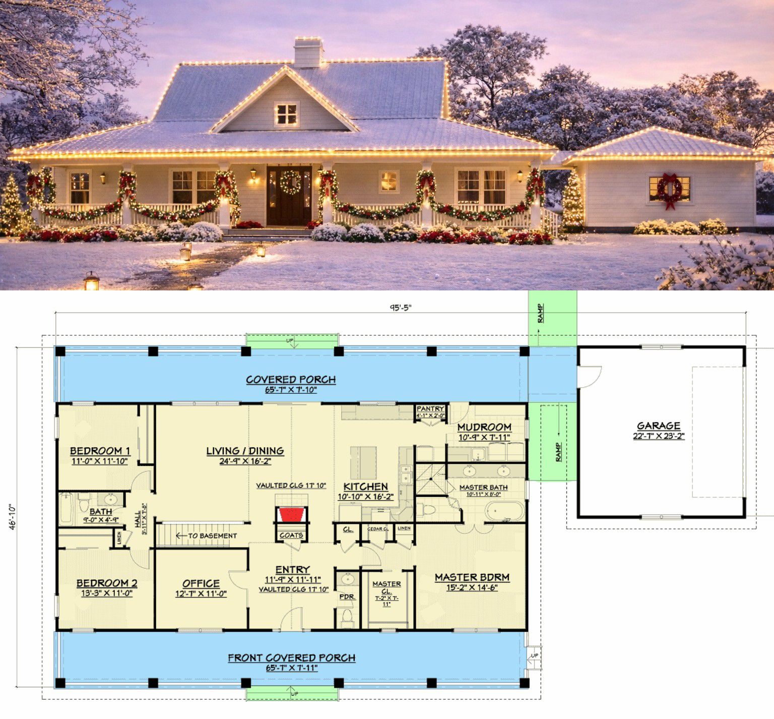 This home measures about 46′ 8″ wide × 59′ 6″ deep with a modest ridge height that keeps the overall scale relaxed and approachable. Standard exterior wall framing and comfortable ceiling heights contribute to a home that feels open and practical without unnecessary complexity.