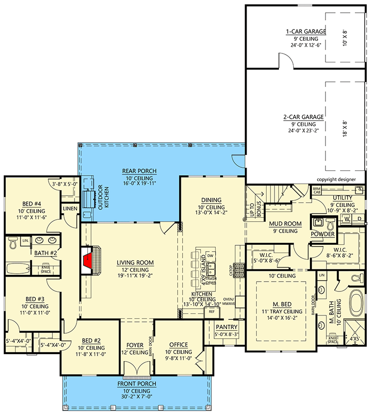 • Ceilings & Structure: 1-story home; first-floor ceiling ~10 ft; living room/foyer ceilings ~12 ft; exterior walls standard 2×4 (upgradeable) 7