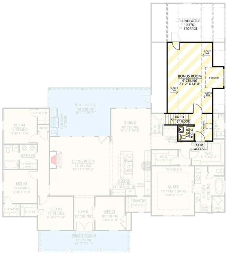 Above the garage lies an optional bonus room (~487 sq ft) — a versatile space that can serve many purposes: a guest suite, home gym, media room, hobby workshop, or additional storage. 15 This flexibility makes the plan future-proof — useful as family needs change over time.