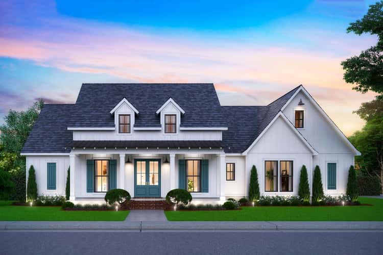 This charming farmhouse plan offers about 2,546 sq ft of heated living space in a single-level layout — spacious yet not excessive. With a flexible configuration of 4 to 5 bedrooms, at least 2.5 bathrooms, and an attached 3-car garage (~896 sq ft), it’s designed to adapt to real life: whether that means a growing family, guests, a home office, or a mix. 0