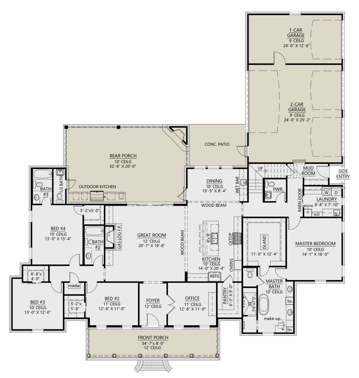 This footprint is perfect for homeowners who want luxury-level comfort—like four full bathrooms—without building something that feels unnecessarily massive.