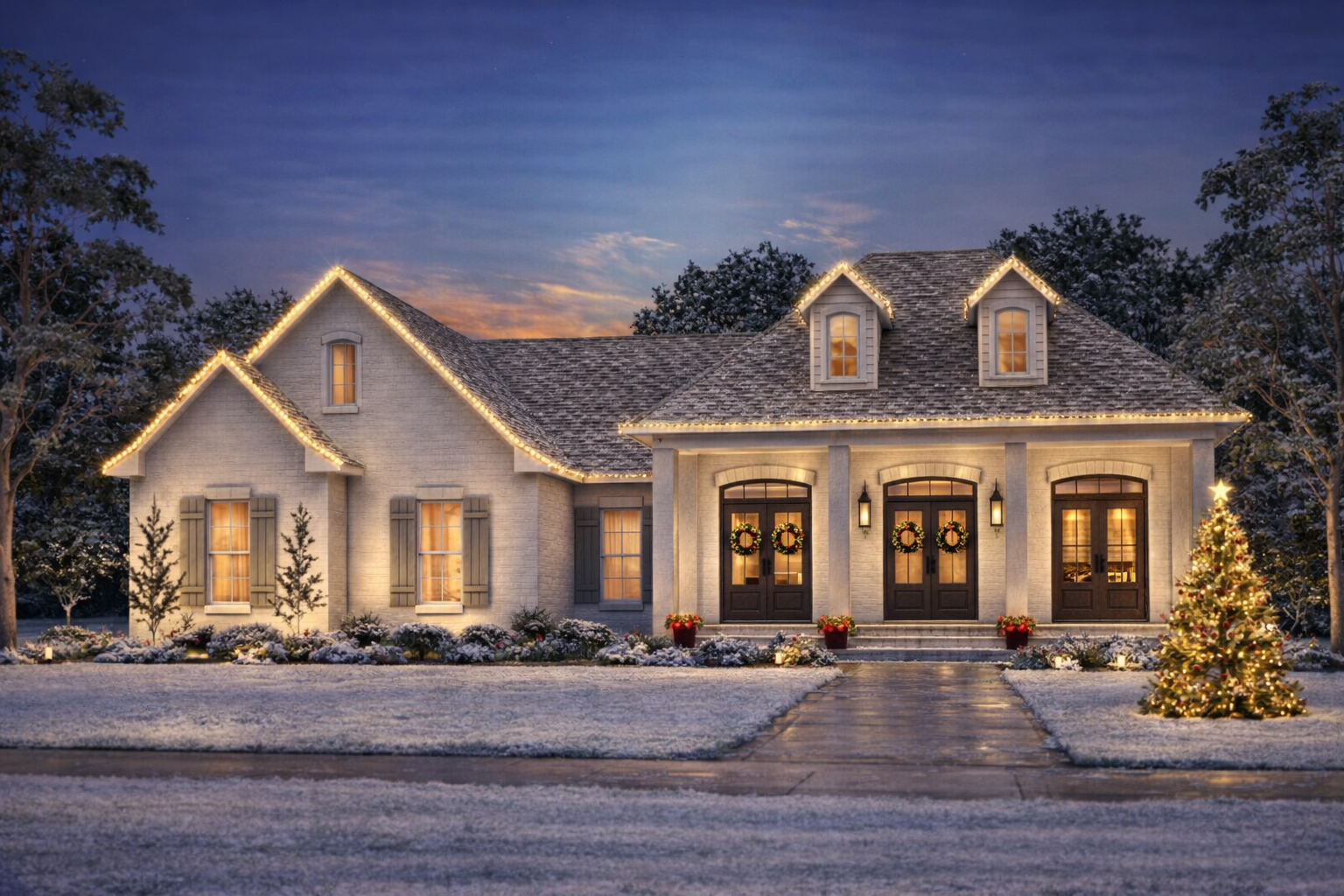 The exterior of this home captures timeless French Country style with refined craftsmanship. 1 A graceful covered front porch sets a welcoming tone, while arched windows and a traditional façade combine to deliver a warm yet stately appearance. 2 Brick or stone accents enrich the exterior texture, adding depth and richness that feels right at home in countryside or suburban settings alike. 3