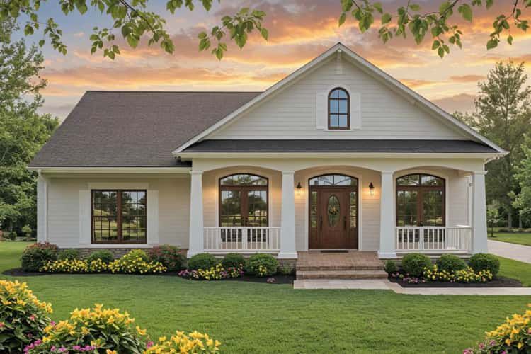 The exterior presents a comforting country silhouette rooted in simplicity and charm. A broad, covered front porch stretches across the façade, creating instant curb appeal and inviting you to pause and enjoy the outdoors. 1 Natural materials and traditional detailing reinforce a sense of warmth, while the overall width and depth give the home a grounded presence without overwhelming the landscape. 2