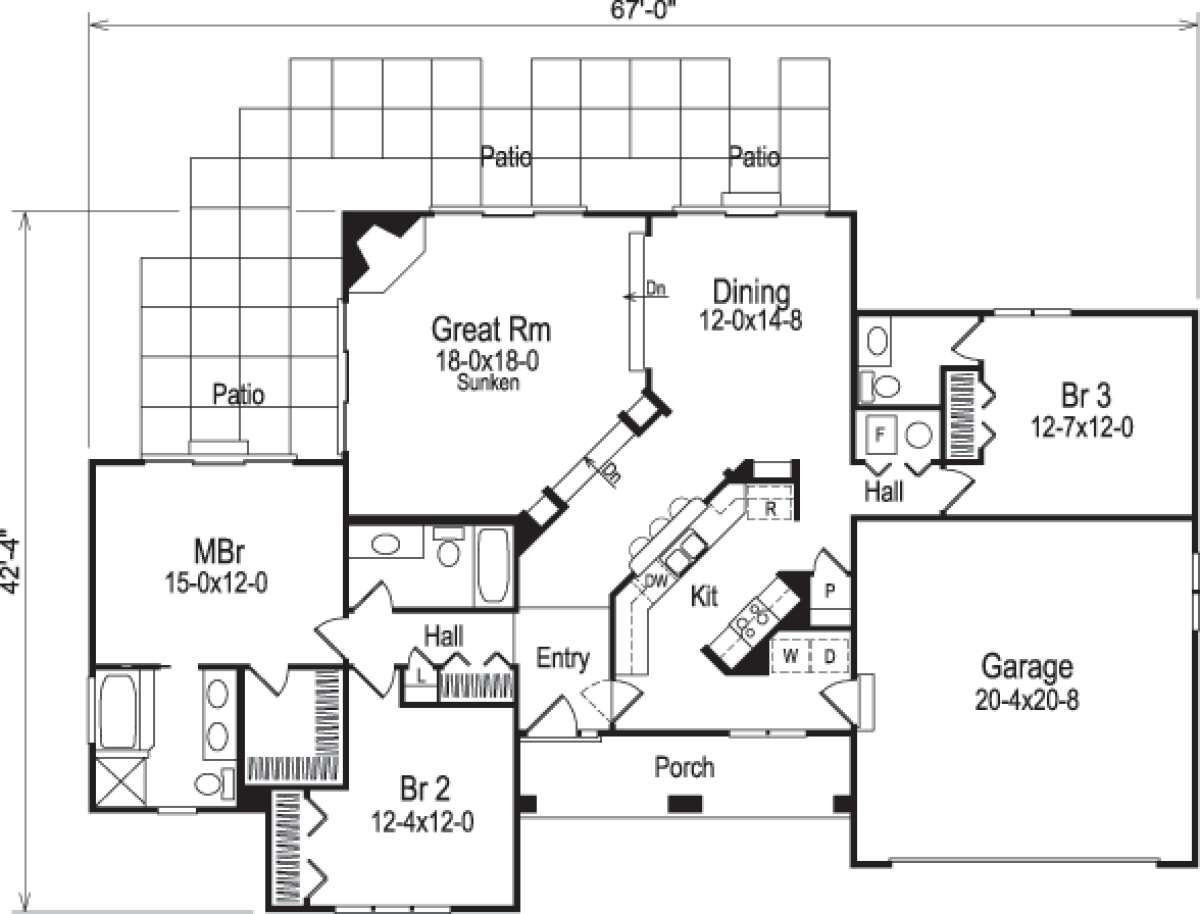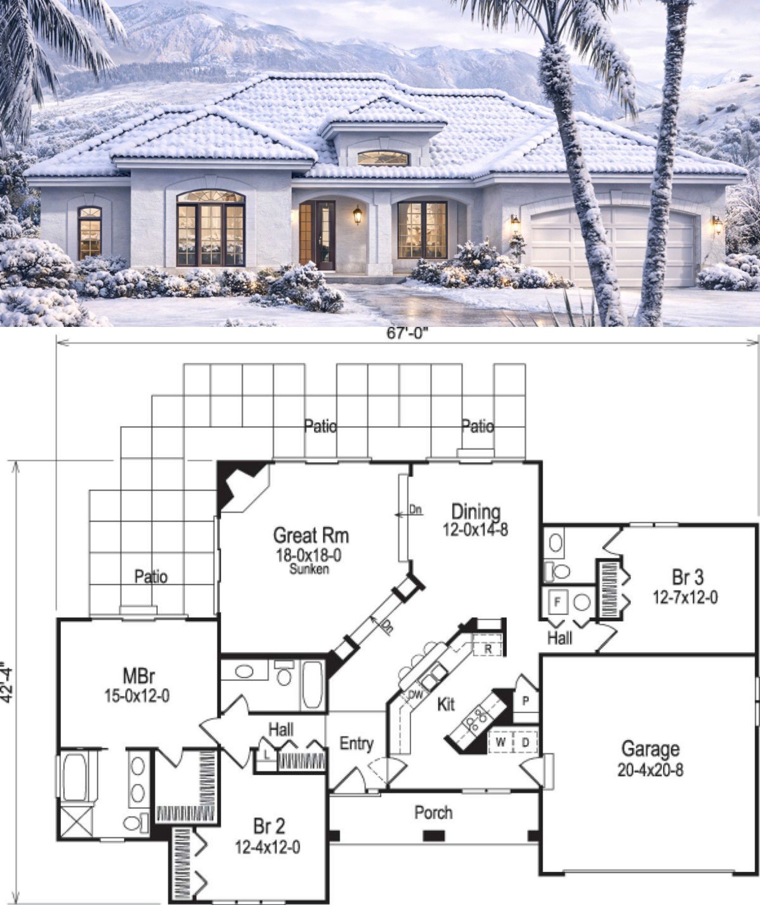 The home measures approximately 67 feet wide and 42 feet 4 inches deep, with an overall height of about 23 feet. The structure features a 8:12 roof pitch and is typically built using 2×4 wood framing. Interior ceiling heights are approximately 9 feet, creating a comfortable and open atmosphere throughout the home. 8