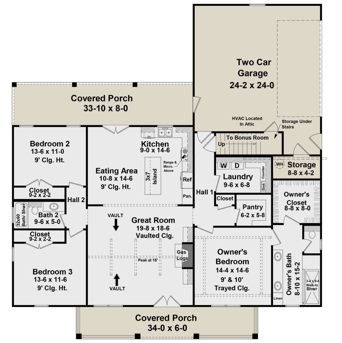 One of the standout features of this plan is the secluded primary suite, tucked away for privacy and appointed for comfort. 12 Its tray ceiling and double doors opening to the rear porch elevate its sense of retreat, while abundant room for furnishings and restful décor makes it feel like a true sanctuary. 13 The attached ensuite bath offers comfort and convenience, and direct access to laundry simplifies daily routines. 14