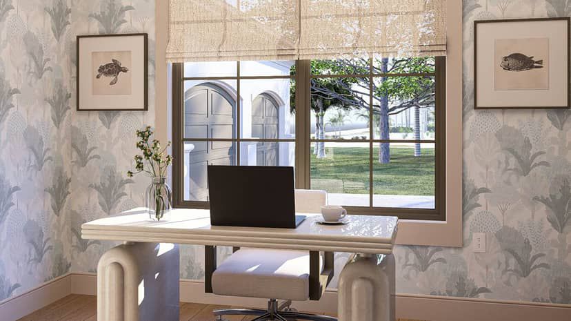 A dedicated home office offers a peaceful workspace with views toward the side motor court — an ideal layout for productivity without distraction from everyday flow. 17 Its location near the front of the home makes it perfect for remote work, virtual learning, or creative pursuits. 18