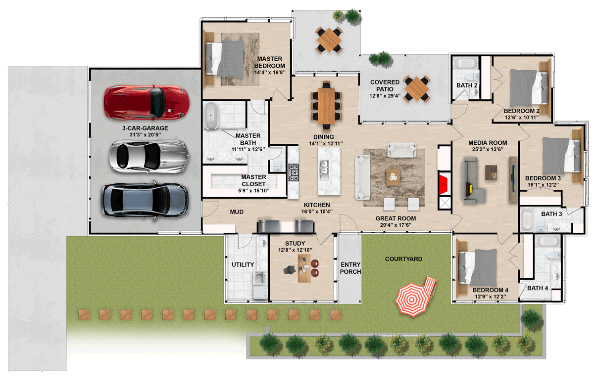 - Courtyard Entry: Covered porch leads to central foyer 0