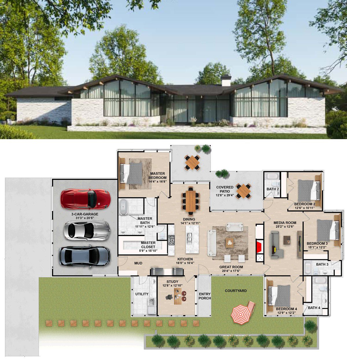 This striking mid-century modern ranch plan provides about 2,800 sq ft of heated living space on a single level. It’s designed with 4 bedrooms, each with its own bathroom, and an attached 3-car side-entry garage (~757 sq ft), alongside an open floor plan ideal for today’s relaxed lifestyle. With a welcoming courtyard entry, versatile work spaces, and expansive outdoor living options, this home blends modern character and everyday comfort with elegant simplicity. 0