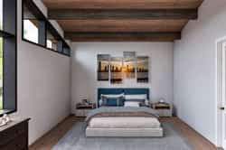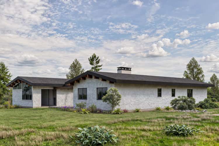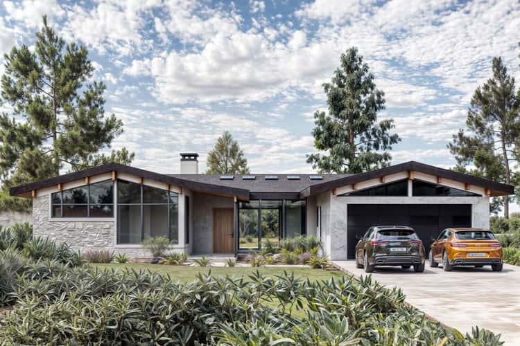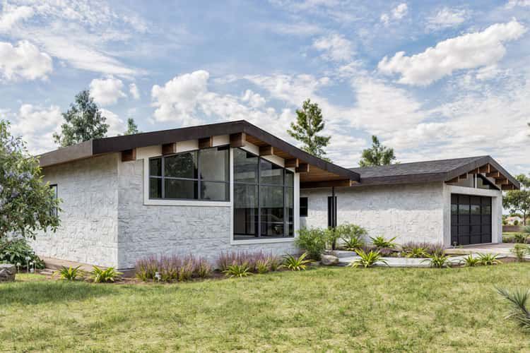 The exterior immediately reflects classic mid-century modern influence through strong horizontal lines, low-pitched roof forms, and wide overhangs. The long, grounded profile emphasizes connection to the landscape while creating a confident, architectural presence.Large expanses of glass and balanced solid wall planes work together to create visual rhythm across the façade. The result is a home that feels timeless and intentional rather than decorative, perfectly suited for a wide lot or suburban setting where the architecture can stretch and breathe.