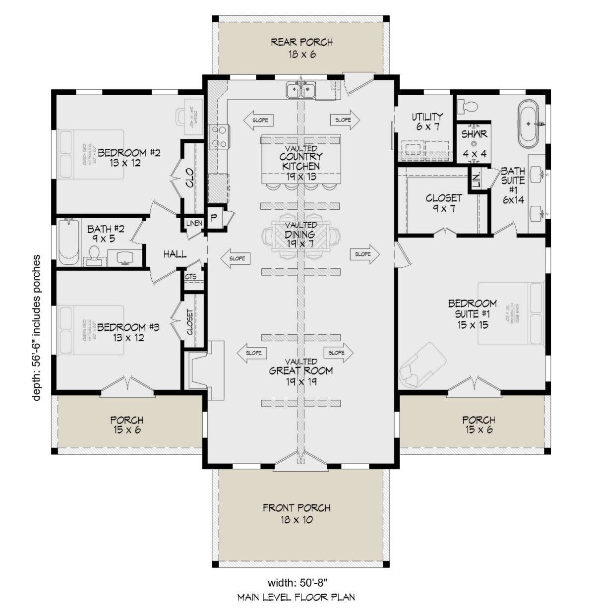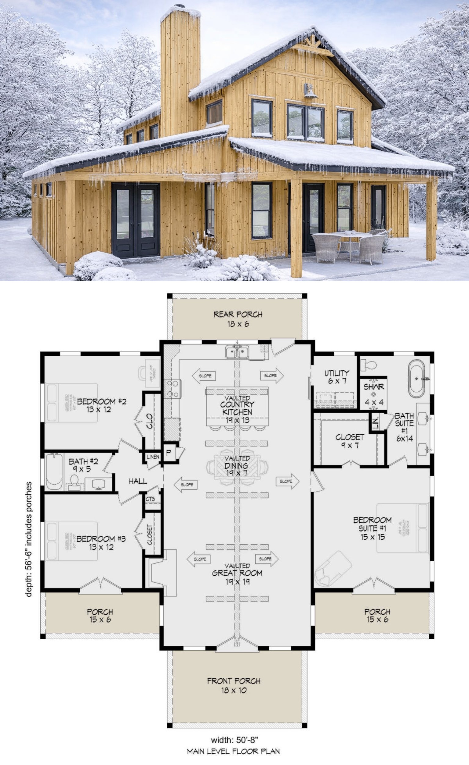 The exterior reflects a classic barn-inspired design with a simple yet striking structure. With dimensions of approximately 50 feet 8 inches wide and 56 feet 6 inches deep, the home offers a balanced footprint that works well on a variety of lot sizes. 1