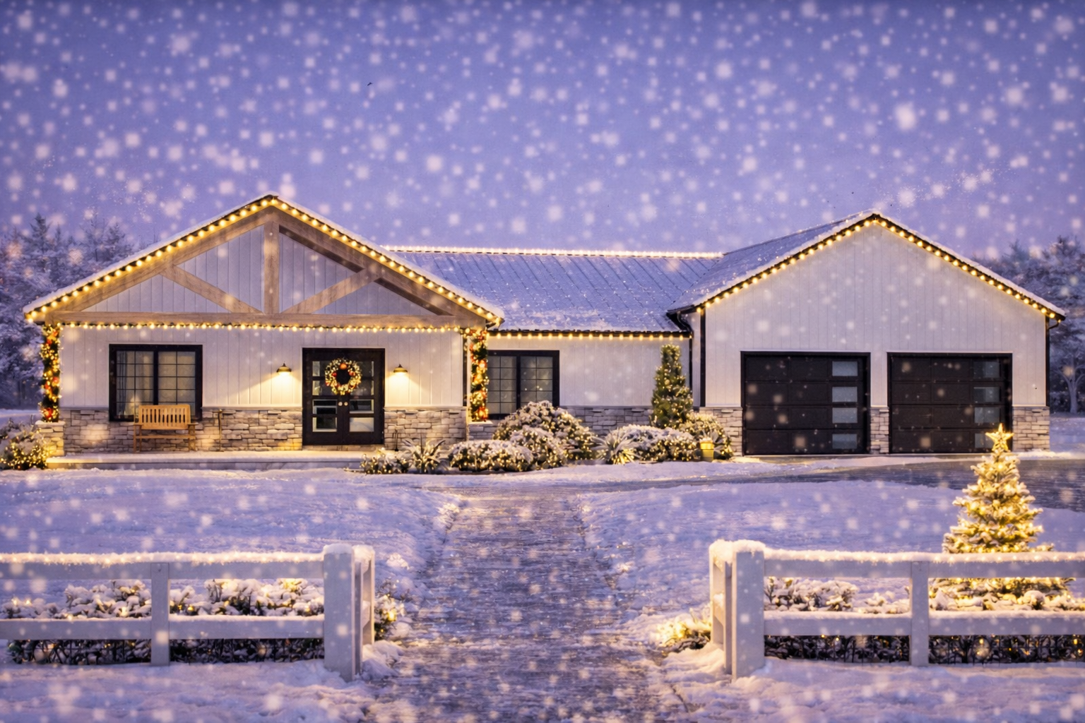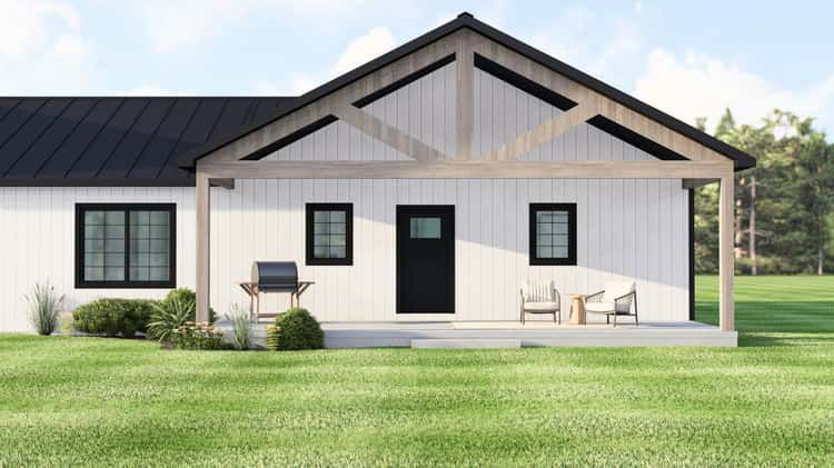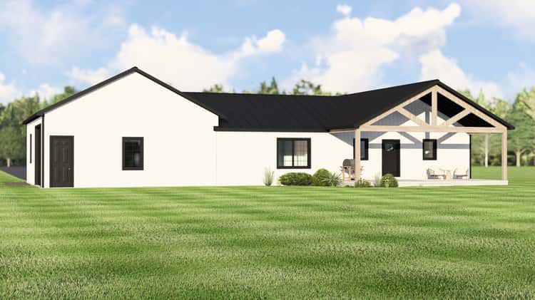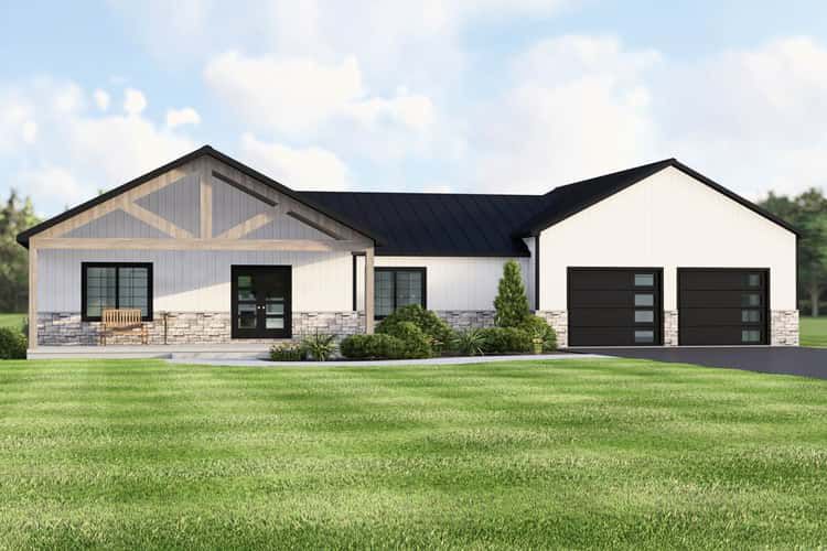 The exterior makes an unforgettable impression with a striking combination of white vertical siding and natural stone wainscoting that balances modern flair with rustic warmth. 1 Clean rooflines and an expansive covered front porch enhance the home’s barndominium character, creating a welcoming façade that feels both grounded and stylish. 2 Large windows throughout the front elevation showcase thoughtful proportions and invite natural light inside while reinforcing the home’s strong architectural presence. 3