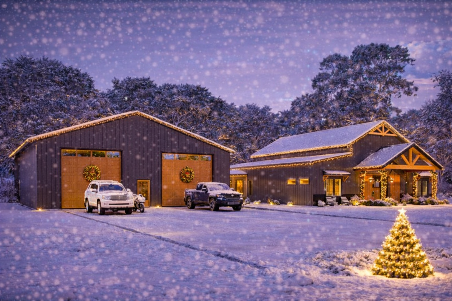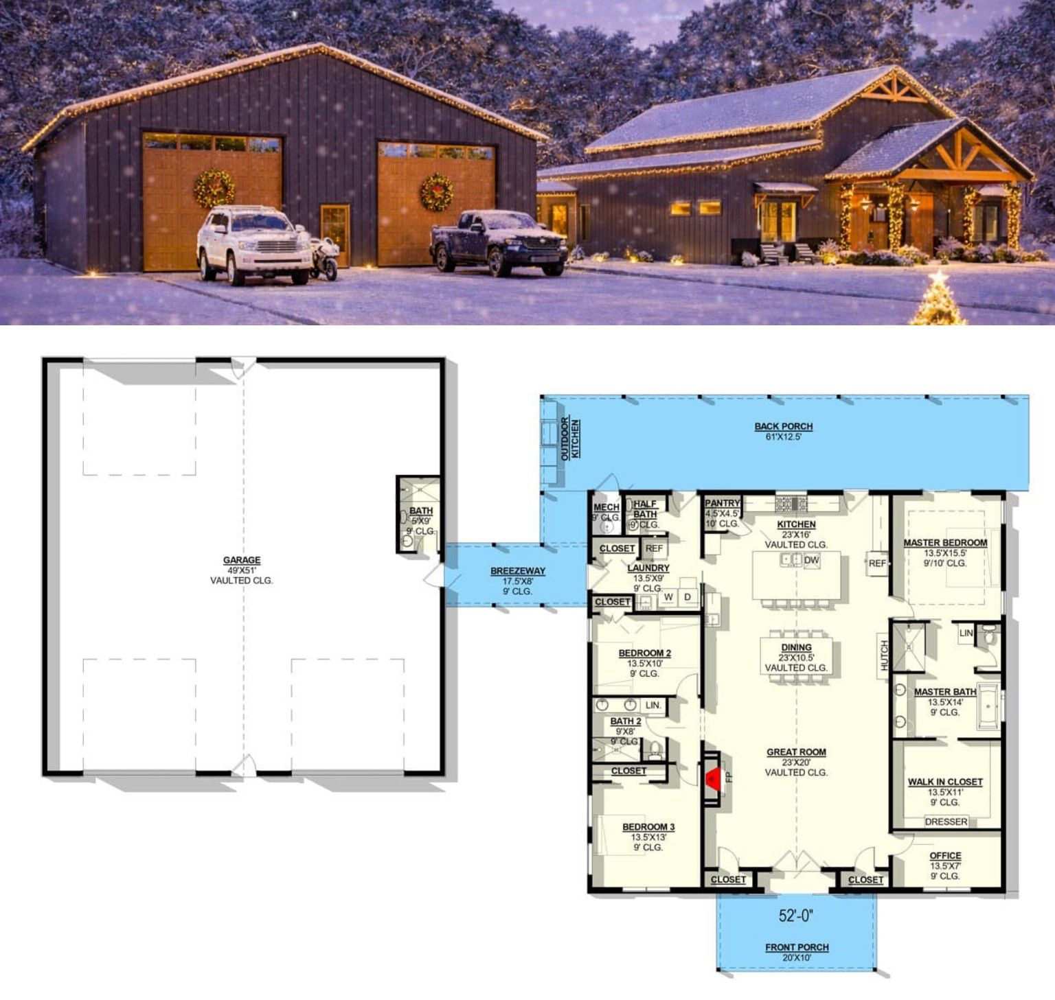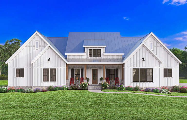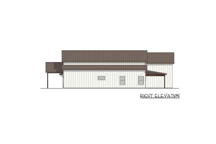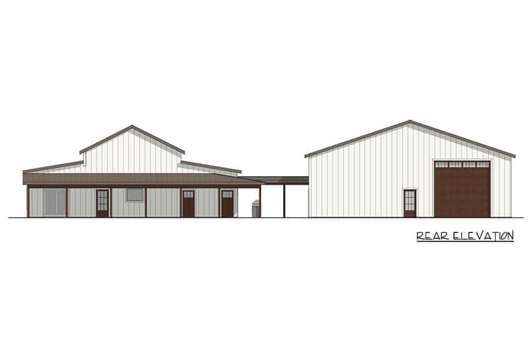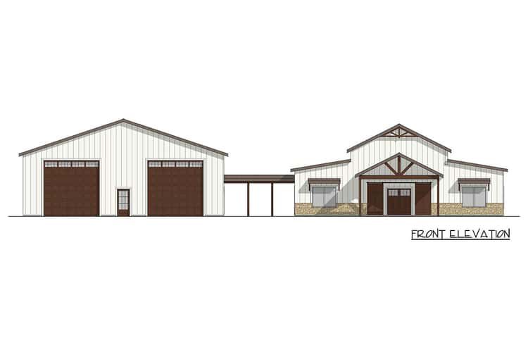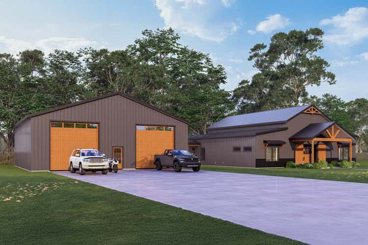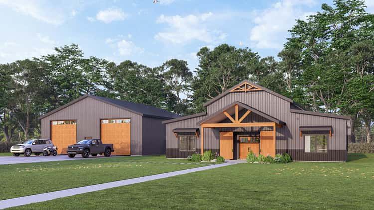 This modern barndominium plan balances open living spaces, practical work and storage zones, and generous outdoor areas with everyday comfort and style. With its soaring vaulted interior, dedicated office, huge garage, and covered entertaining spaces, it’s a design built for both function and memorable family living.