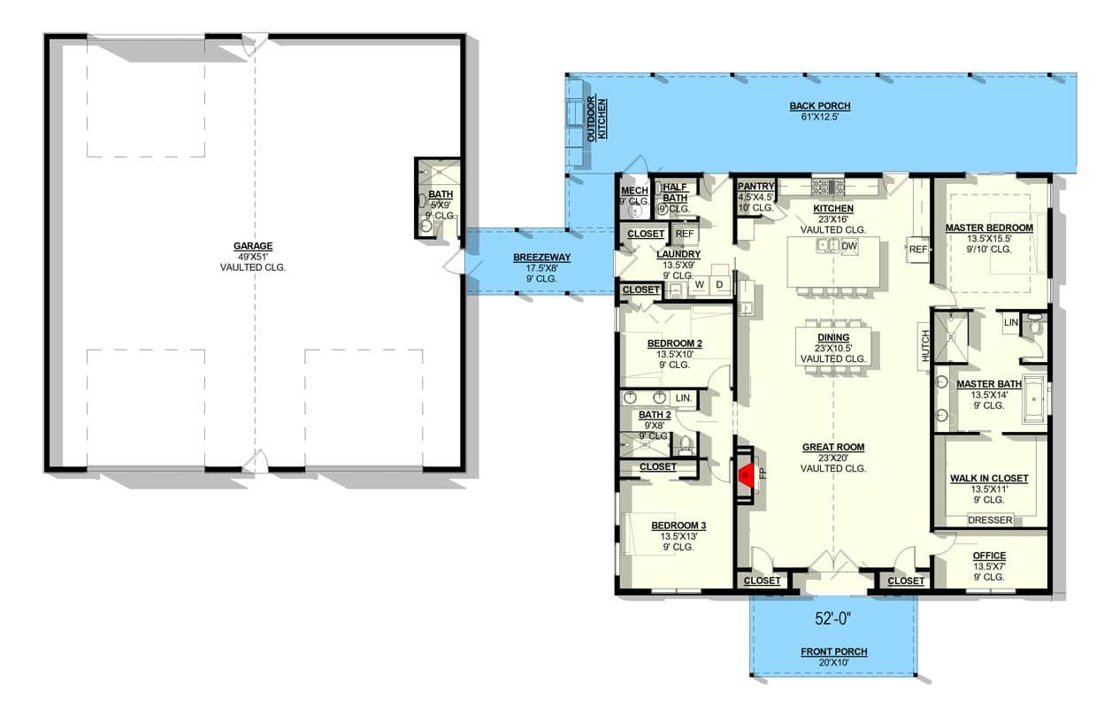 One of this plan’s standout features is its enormous attached 3-car garage (~2,444 sq ft), which accommodates vehicles, toys, hobbies, and workshop needs with ample room to spare. 22 With both front and rear garage entries, loading and unloading large items is convenient and flexible. 23 Whether you’re storing tractors, classic cars, or building projects, this garage space feels exceptional in scale and potential. 24