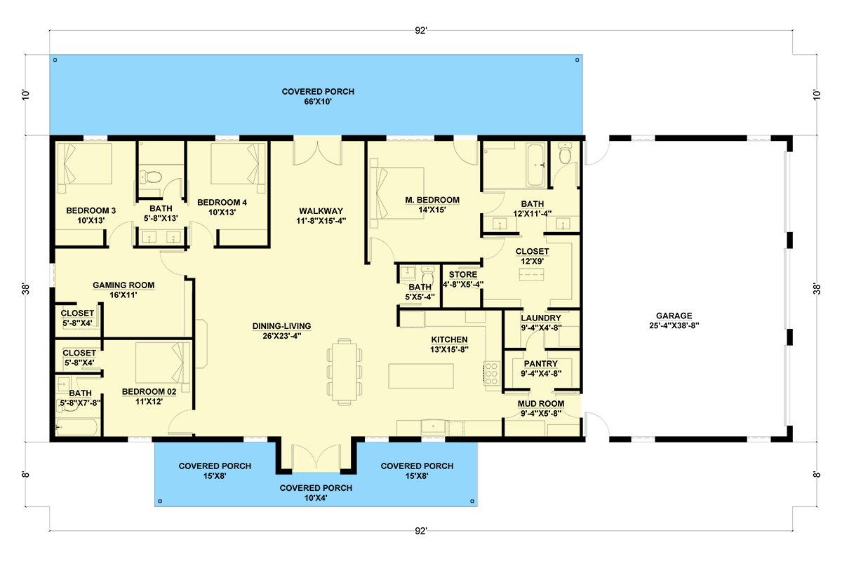 - Dimensions: ~92′ wide × ~38′ deep 0