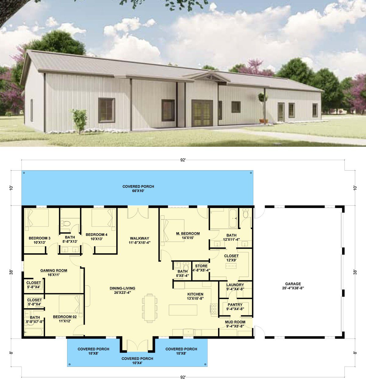 The exterior showcases contemporary Barndominium style: clean gable lines and expansive covered porches that stretch the home’s footprint while creating strong shelter and outdoor gathering zones. 0 Its footprint of roughly 92′ wide × 38′ deep keeps a commanding yet approachable presence on the lot, while the low roof ridge height of about 18′ 4″ maintains a grounded silhouette. 0 The side-entry 3-car garage blends into the design, giving easy driveway access without overwhelming the living facade. 0 0