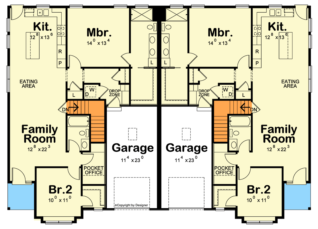 This duplex design features a split-bedroom layout that enhances privacy and flexibility. The master suite is positioned on one side of each unit, offering a quiet retreat with a spacious bedroom, an attached full bathroom, and a walk-in closet. 8 The secondary bedroom sits on the opposite side, served by its own full bathroom, making this plan equally comfortable for guests, roommates, or small families. 9