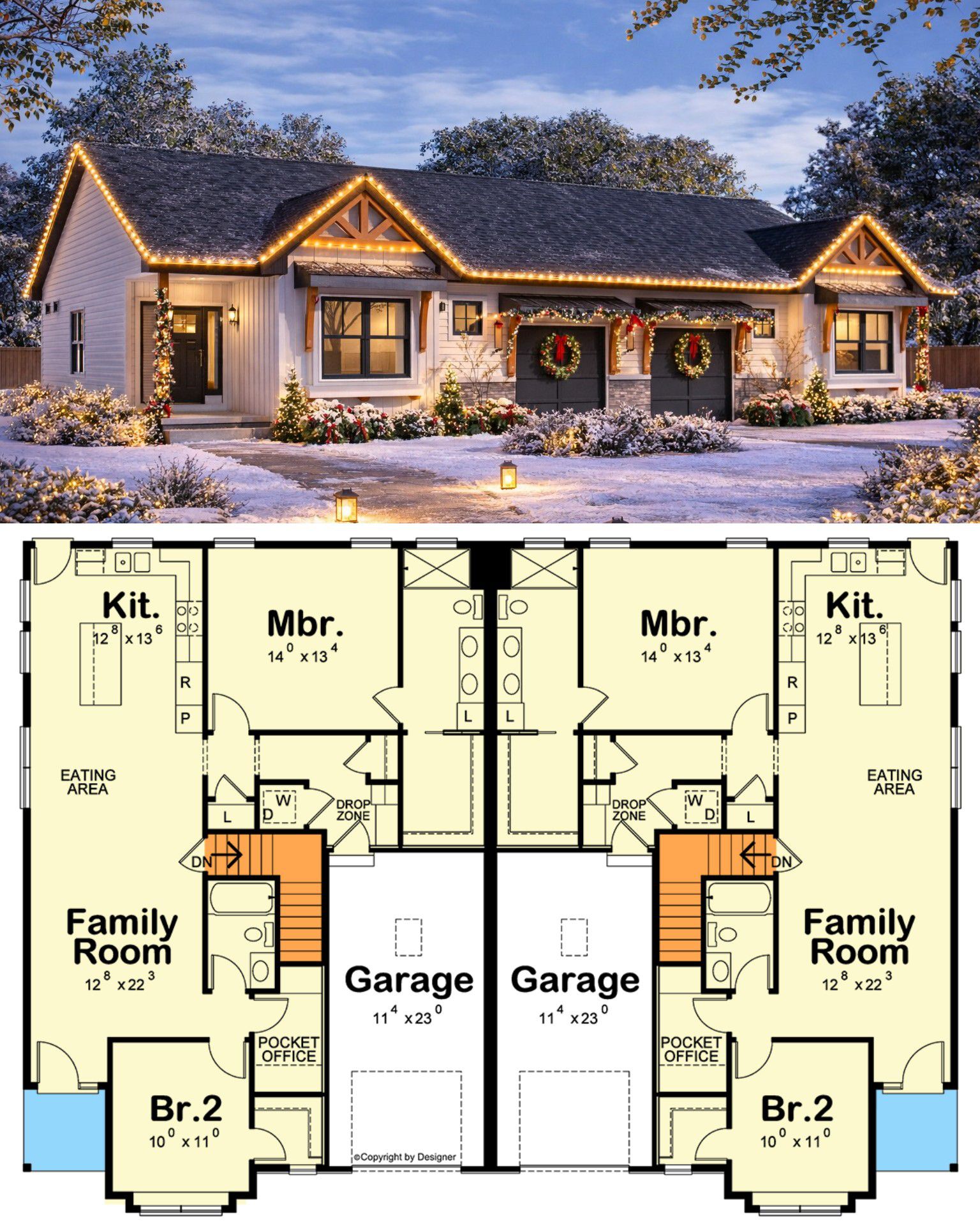 This thoughtfully designed Modern Craftsman duplex plan offers approximately 2,570 sq ft of total heated space divided into two perfectly mirrored units of about 1,285 sq ft each. Featuring a clean modern Craftsman exterior with warm architectural details, each side includes 2 bedrooms, 2 full bathrooms, a private 1-car garage, and a bright, open interior that supports casual living, daily routines, and flexible work-from-home needs. With its split-bedroom layout and included home office space, this duplex plan blends everyday comfort with thoughtful separation between private and communal zones. 0