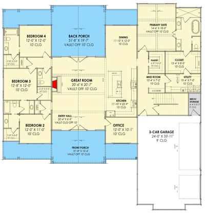 The plan includes a dedicated mud-room area by the garage entry, helping transition from outdoors to indoors smoothly. The construction uses standard 2×4 exterior walls (with optional 2×6 upgrade) and the maximum ridge height is about 28′ 3″, which balances scale with buildability. 8