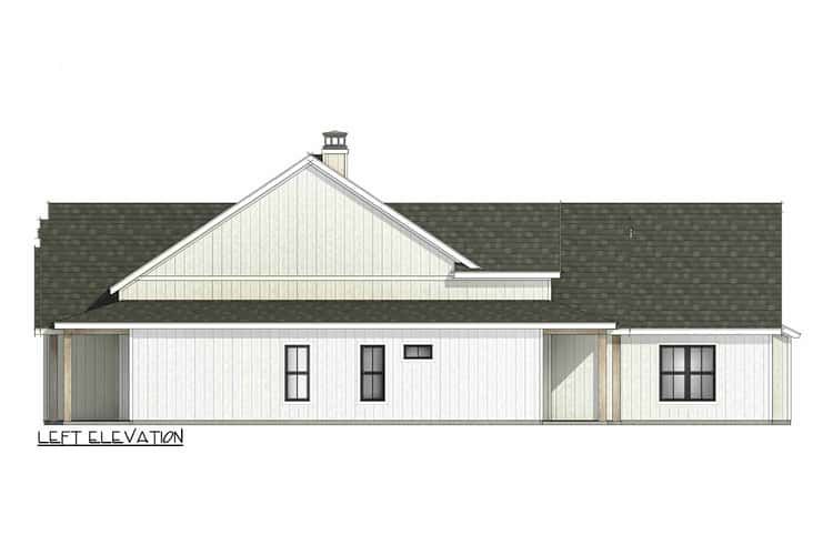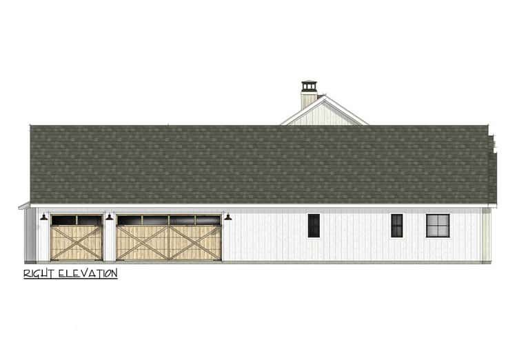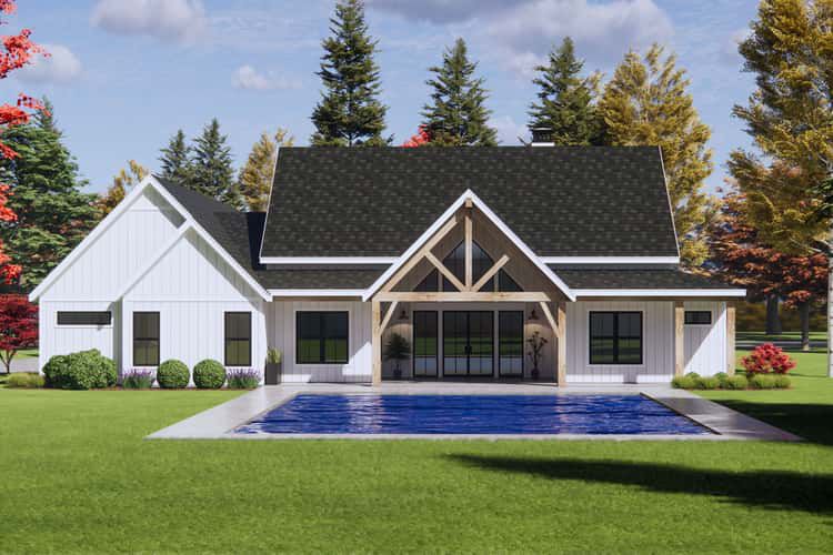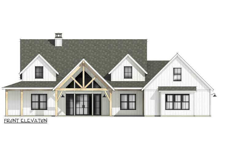 The footprint spans roughly 76′ 2″ wide by 79′ 5″ deep. 1 The exterior design speaks classic modern farmhouse: steep roof pitches (primary 12 on 12, secondary 8 on 12) and clean siding lines give a crisp, yet comforting façade. 2