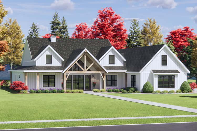 This modern farmhouse plan offers approximately 3,000 sq ft of heated living space, with a layout featuring 4 bedrooms, 3.5 bathrooms, a sizable three-car garage, and an optional bonus room of about 553 sq ft. 0
