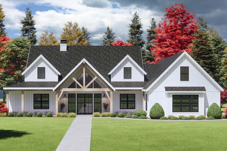 The footprint spans roughly 76′ 2″ wide by 79′ 5″ deep. 1 The exterior design speaks classic modern farmhouse: steep roof pitches (primary 12 on 12, secondary 8 on 12) and clean siding lines give a crisp, yet comforting façade. 2