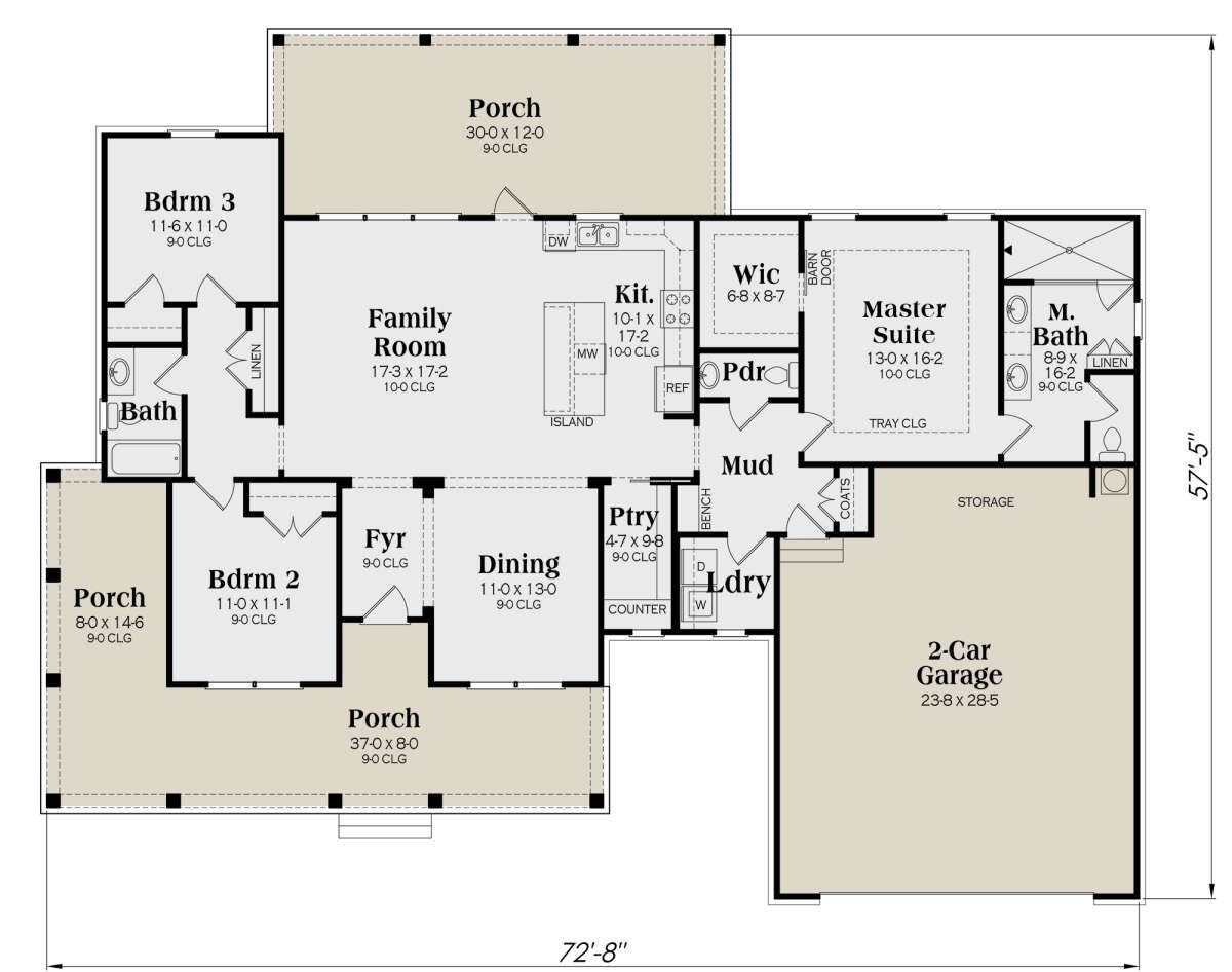 - Covered porch: Extends living space outdoors.