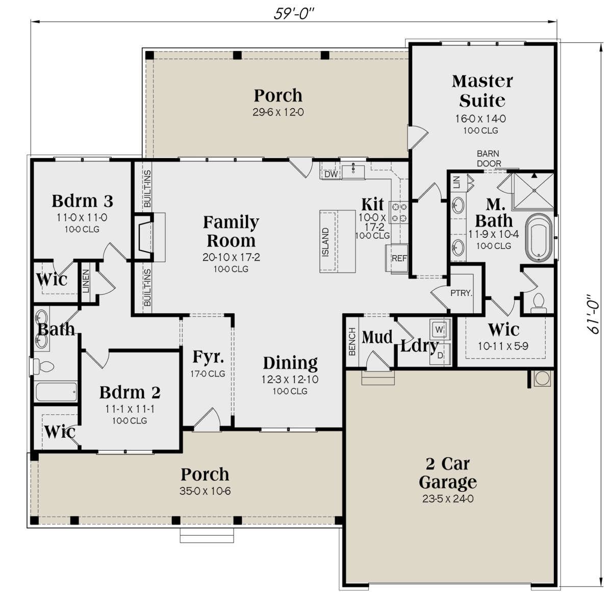 The exterior showcases a classic farmhouse style with clean lines, balanced proportions, and a welcoming presence. The home measures approximately 59 feet wide and 61 feet deep, giving it a strong yet practical footprint. 1
