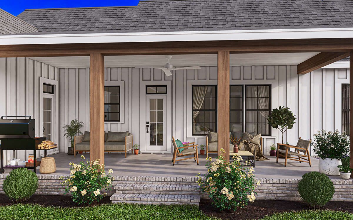 The design allows for easy integration of outdoor living areas such as patios or porches, enhancing the overall lifestyle experience.