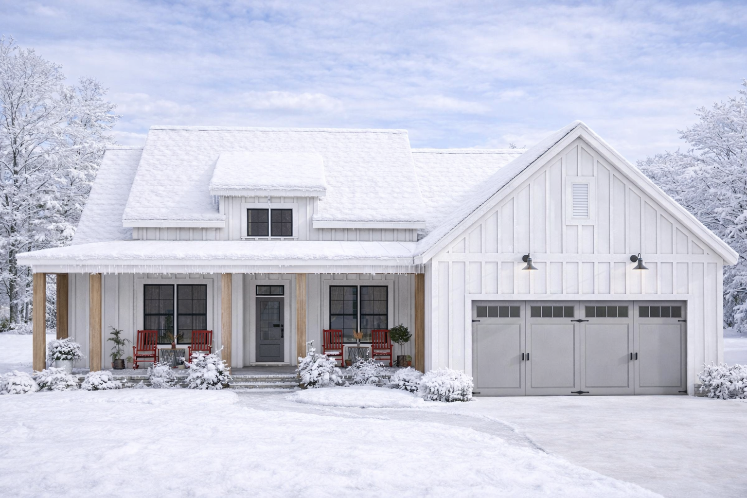 The exterior showcases a classic farmhouse style with clean lines, balanced proportions, and a welcoming presence. The home measures approximately 59 feet wide and 61 feet deep, giving it a strong yet practical footprint. 1