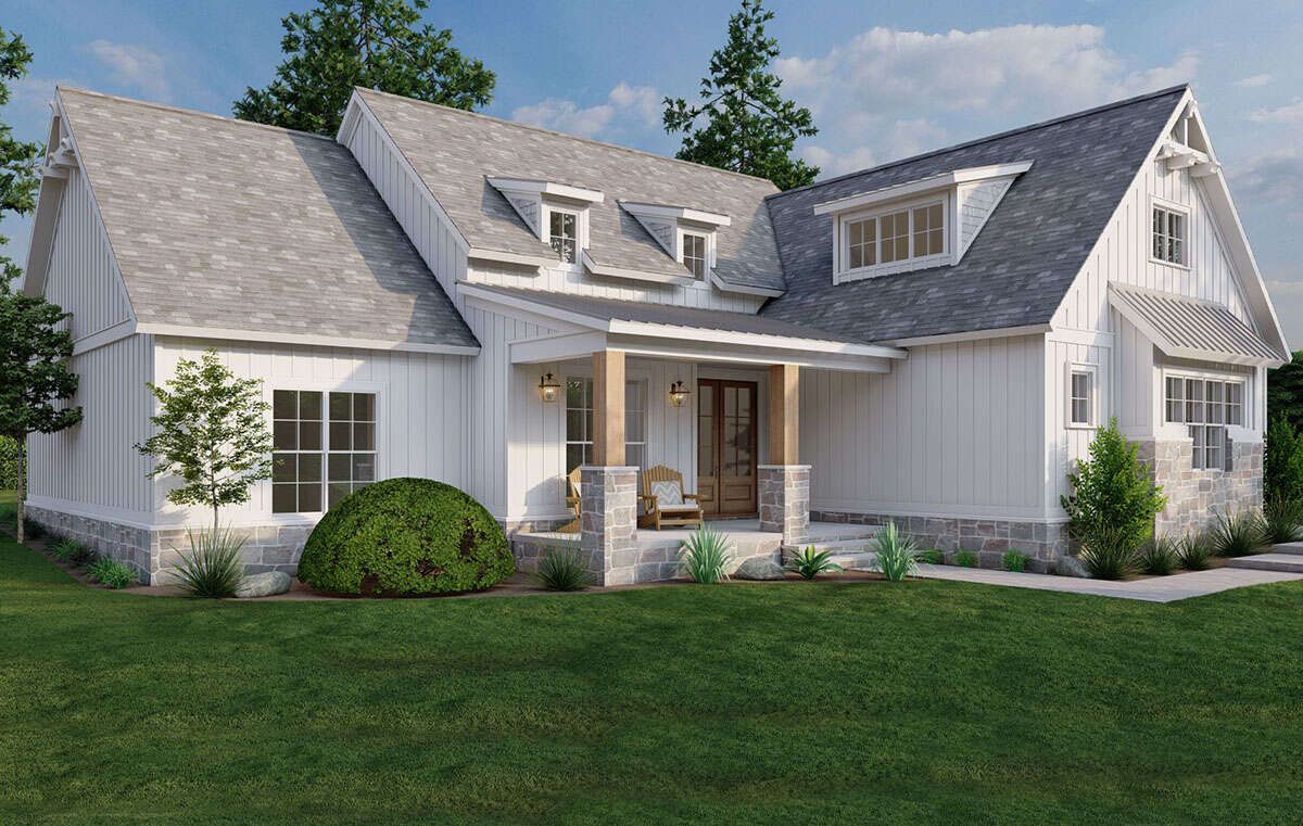 Covered porch areas enhance the home’s charm while providing outdoor living space that complements the farmhouse lifestyle.