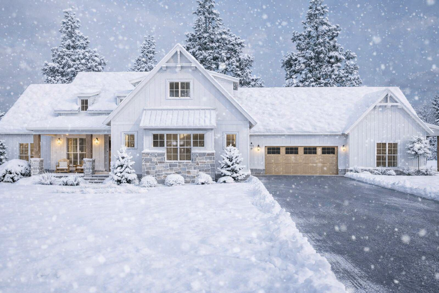 The exterior showcases a timeless farmhouse design with a wide and balanced structure. The home features a large footprint and often includes a four-car garage, giving it both a bold presence and practical functionality. 1