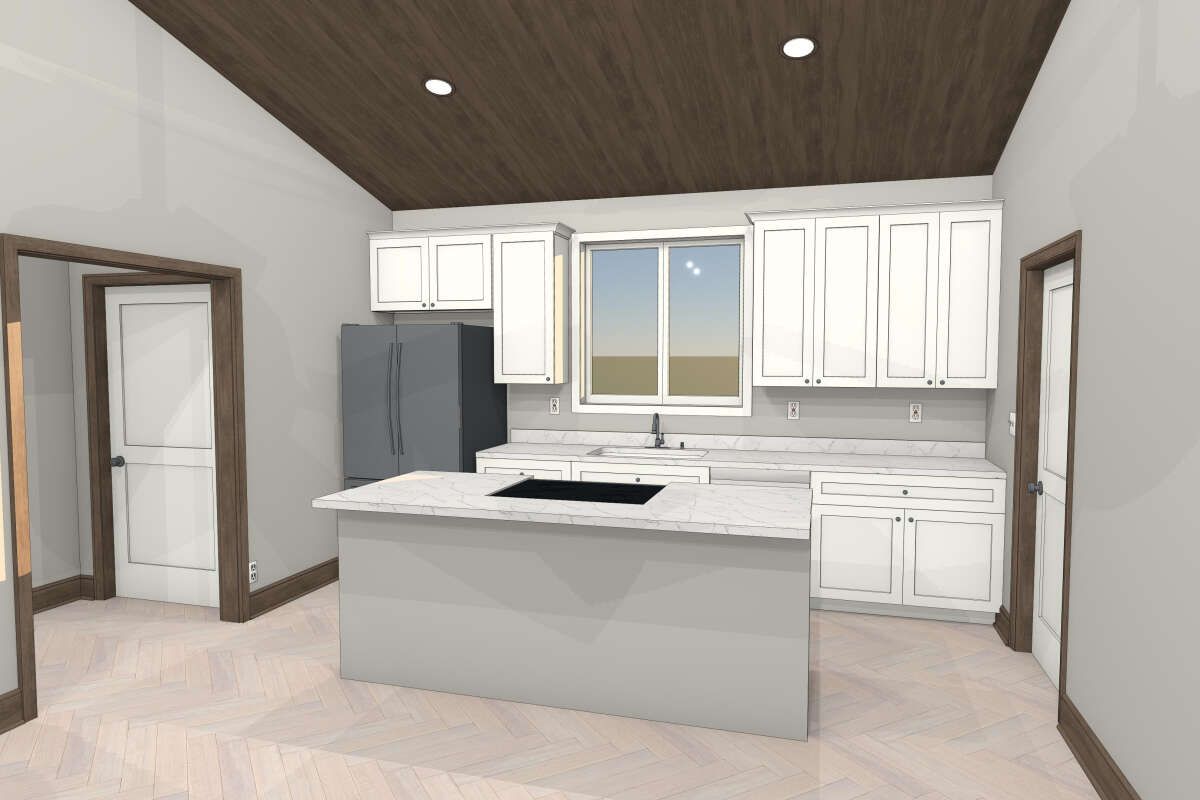 The kitchen is centrally located and designed for functionality, featuring a kitchen island that provides extra workspace and seating. 4