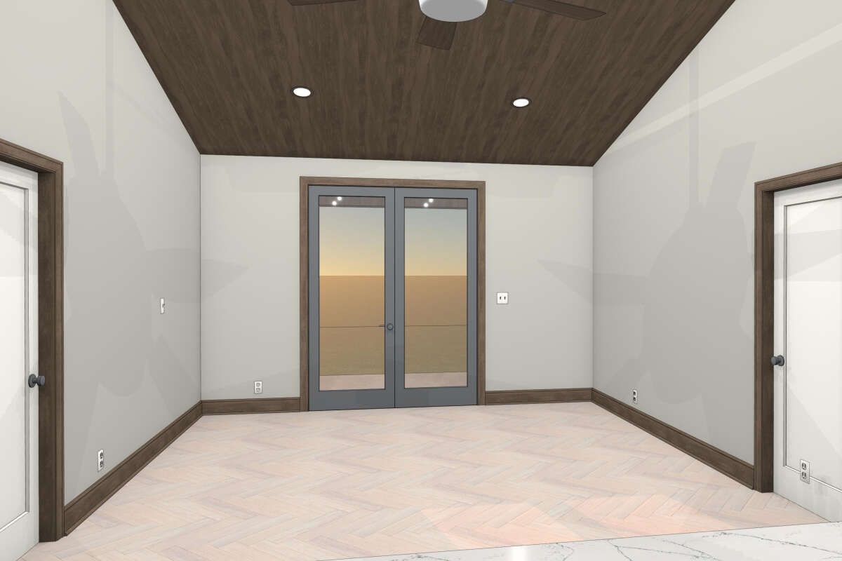 The design incorporates a split-bedroom layout, placing the primary bedroom on one side and the secondary bedroom on the opposite side. 6