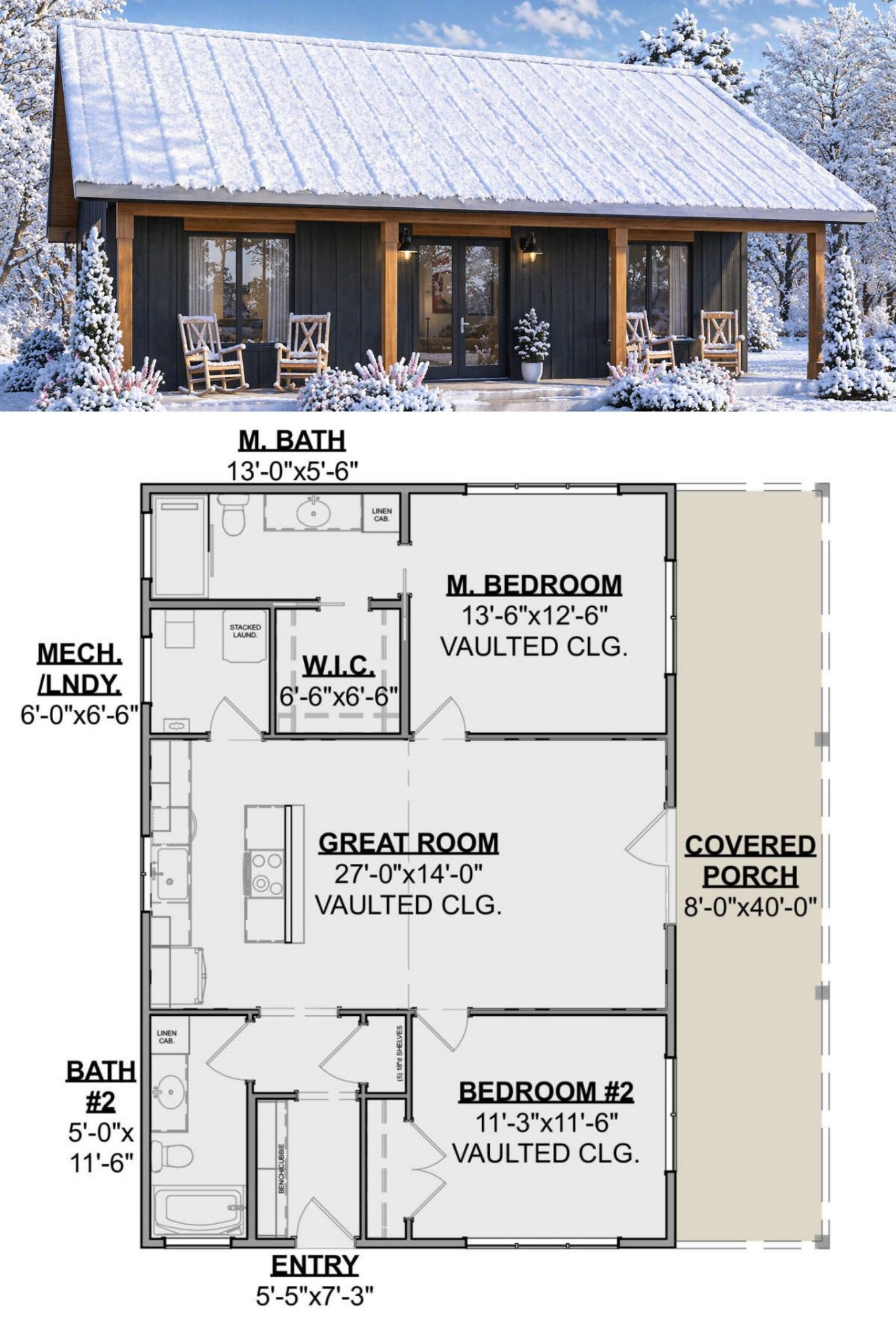 Modern Farmhouse Plan – 1,114 Sq Ft, 2 Bedrooms, 2 Bathrooms