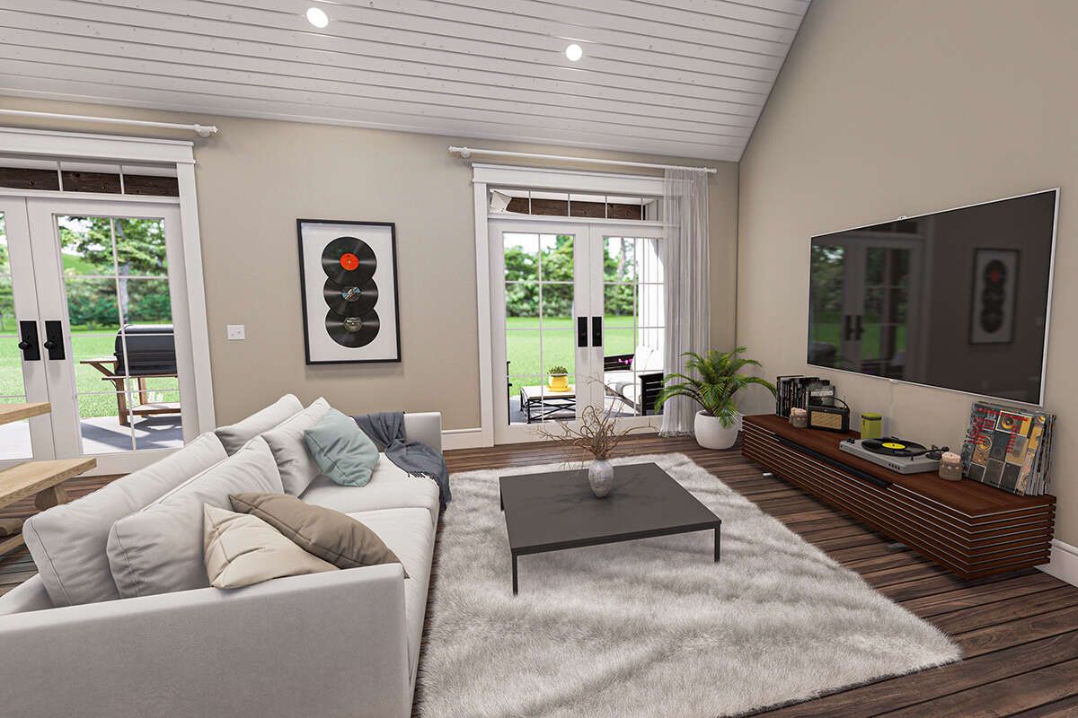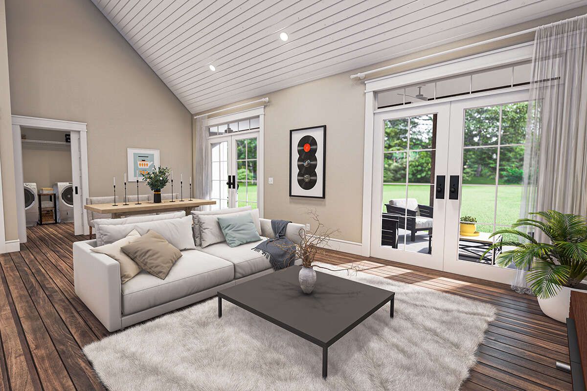 Vaulted ceilings enhance the openness of the space, while French doors provide direct access to outdoor porches, allowing natural light to flow throughout the interior. 4